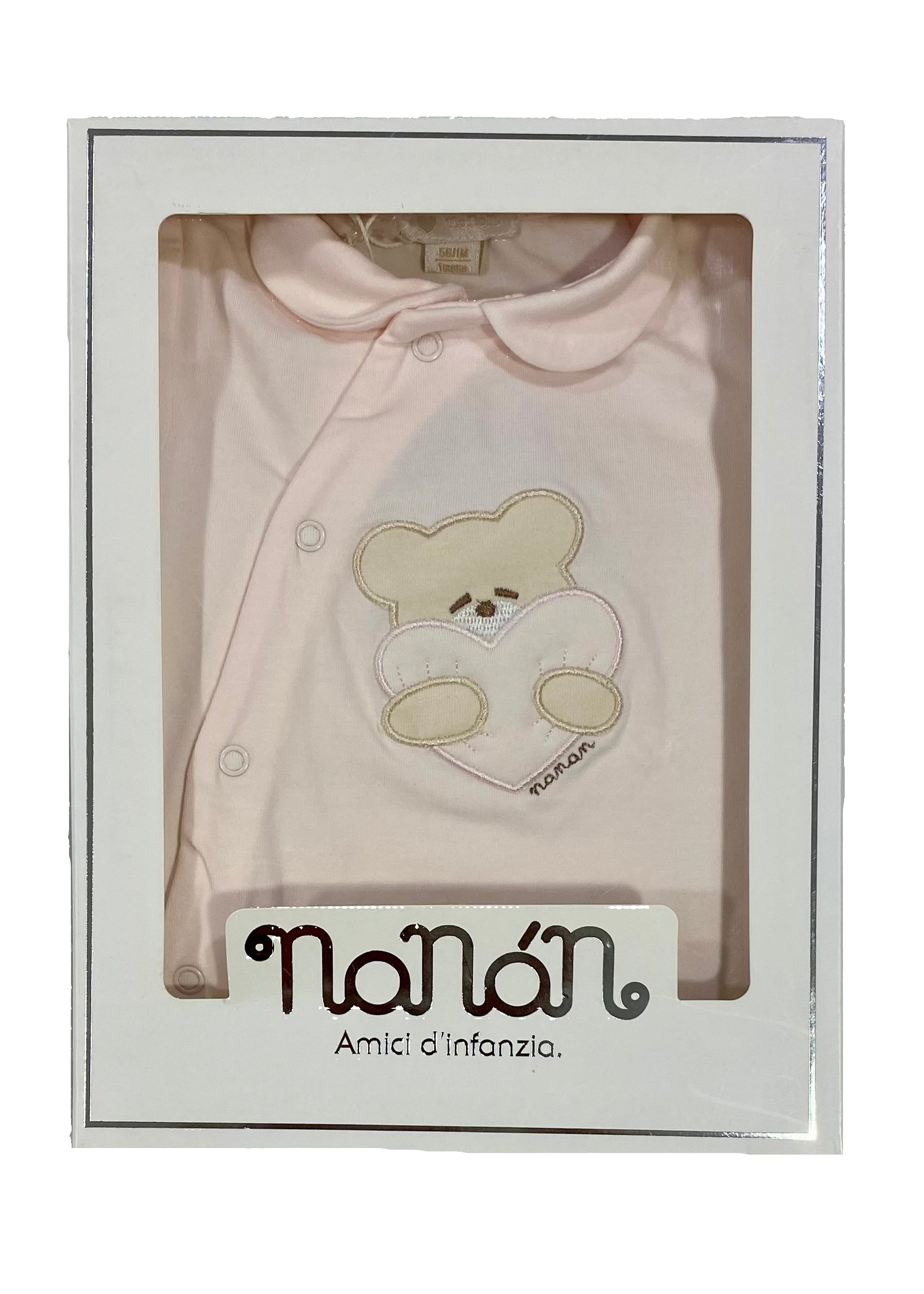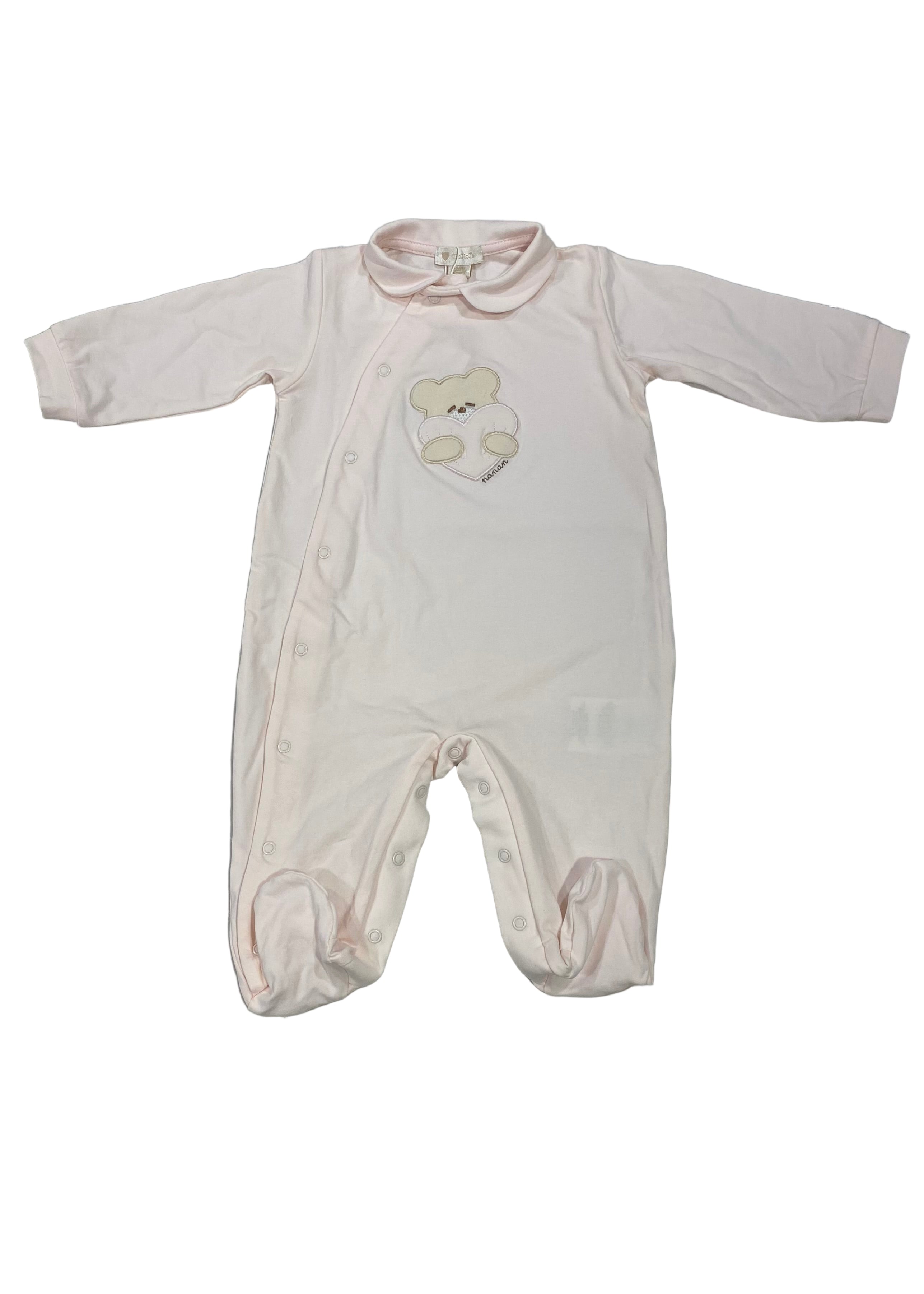 Soft fabric with embroidered teddy bear romper has sideways snap button fastening. Comes with in a branded gift box.
