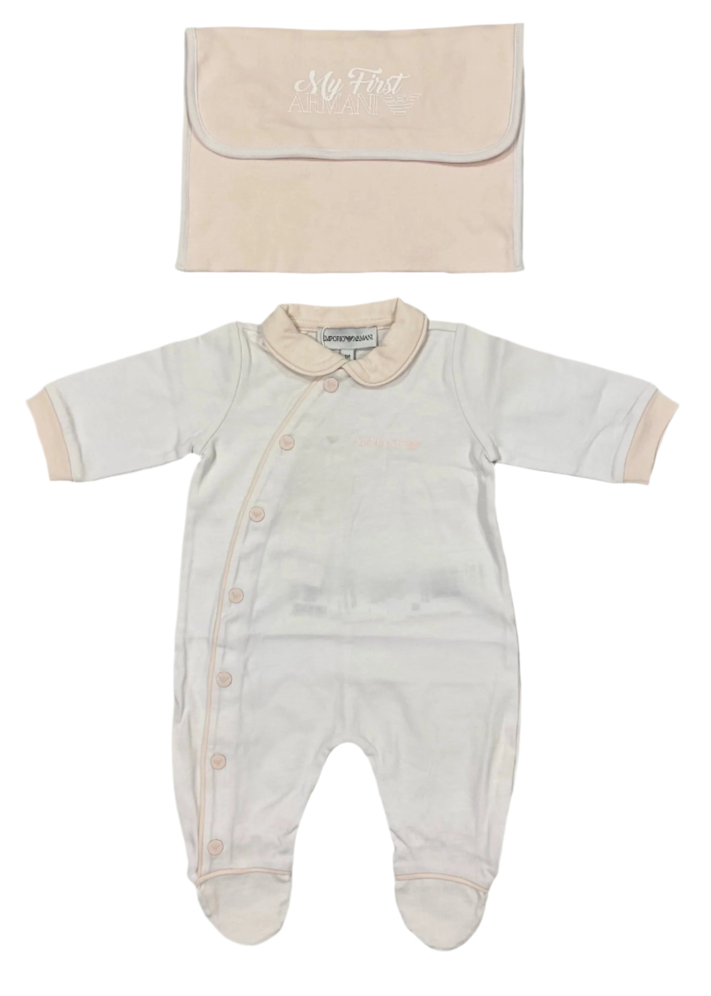 Knitted fabric, sideways snap branded button open romper. With peter pan collared and Armani eagle logo on left chest. Soft and comfortable outfit for your baby.