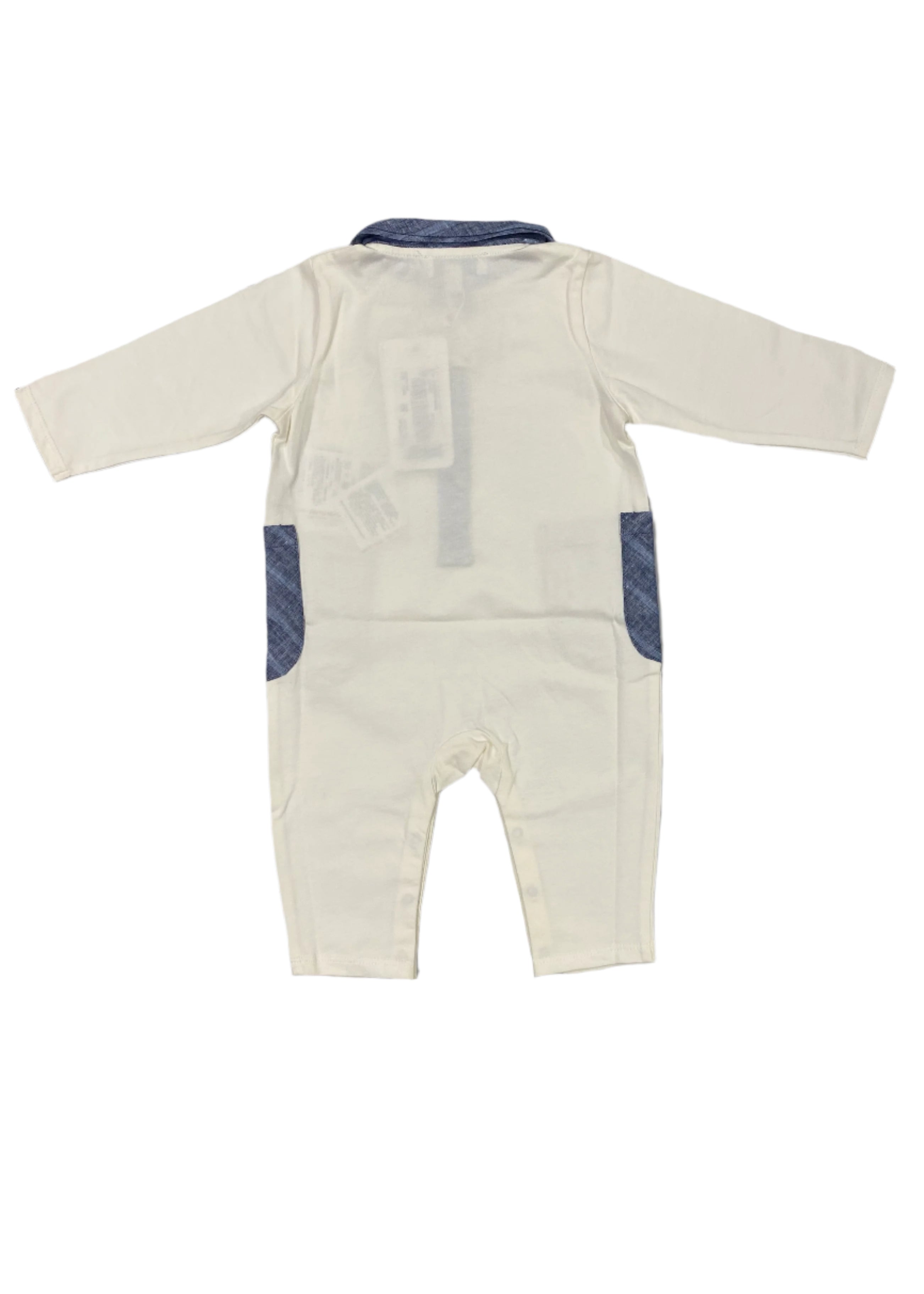 Made from the softest cotton jersey. Collared romper with two front pockets. Has closure buttons at front and a snap button between the legs for easy dressing.