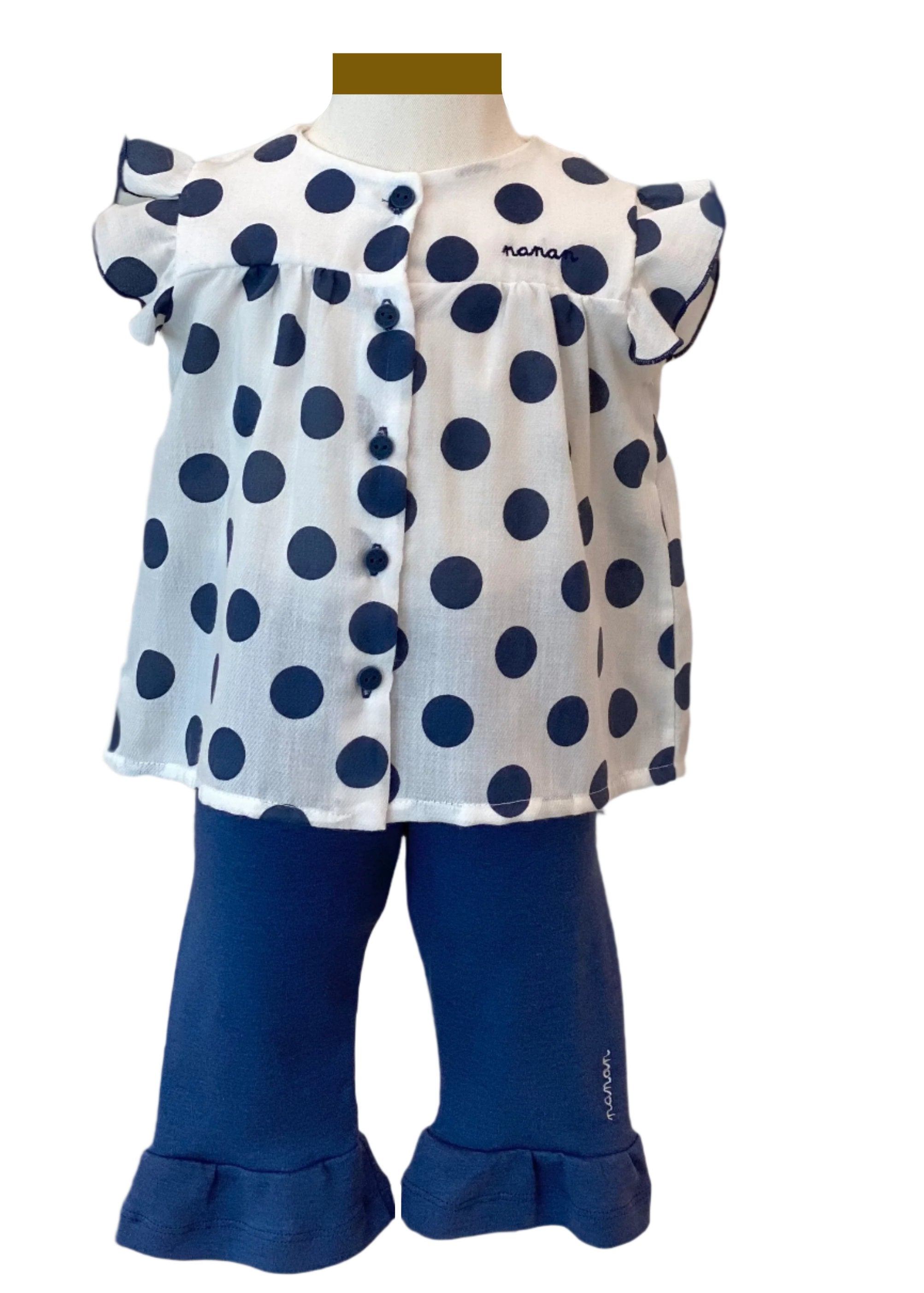 Casual baby girl outfit. This set comes with a polka pattern print blouse, front button fastening, semi ruffle on sleeves. This set also comes with a soft pants with ruffle trim.