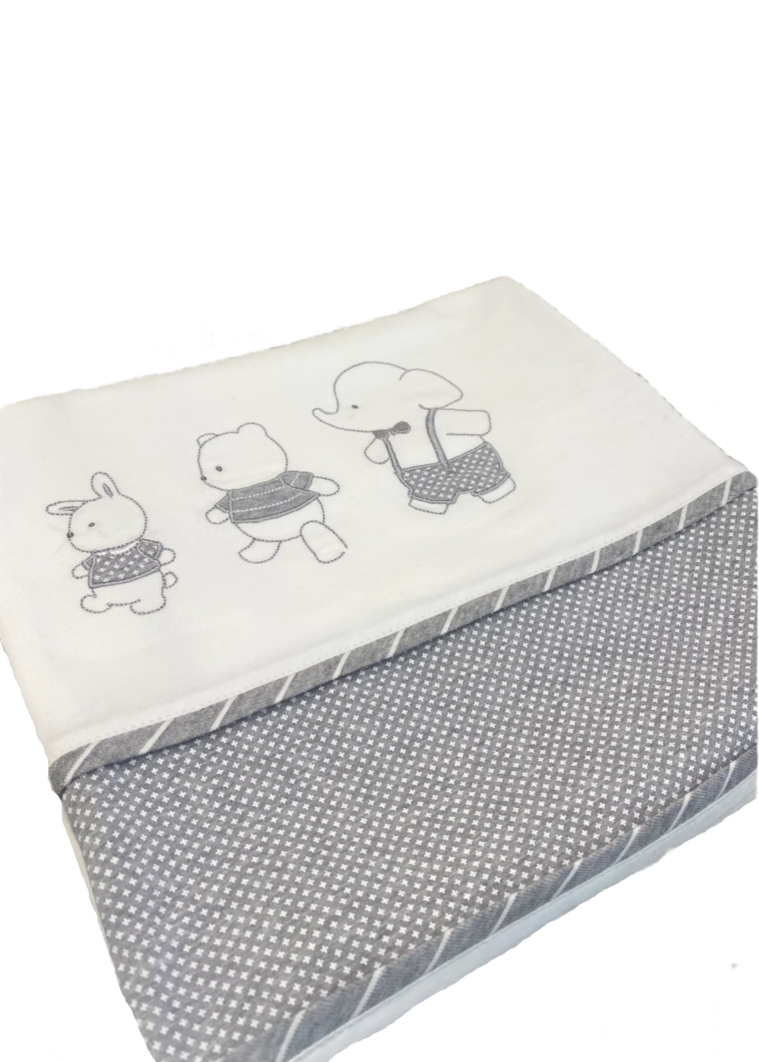 Baby blanket featuring adorable rabbit, bear and elephant embroidery. Finished with slanted lines on the edge, in white and gray color.