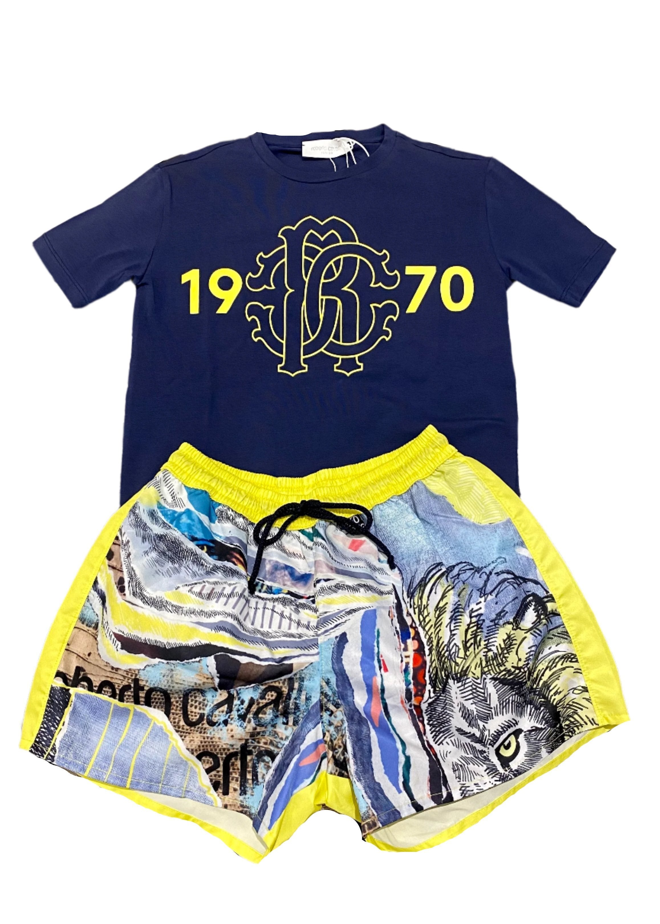 A set of t-shirt and swim boxers. Top is designed with '19 RC 70' print in rubber material as a design. Swim boxers have an abstract collage print design, pull string waistband.