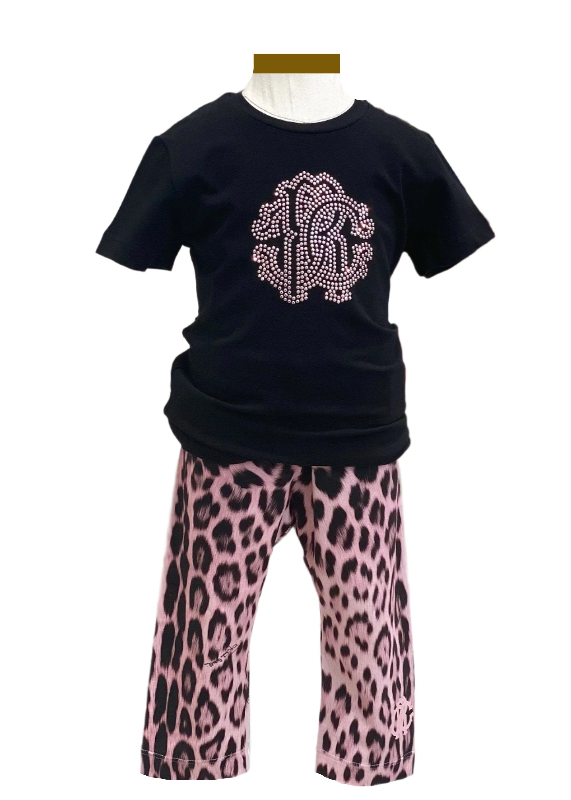 Snug-fit outfit. This set comes with a stretchy, soft, short sleeves top designed with 'RC' logo in rose gold studs. The top is matched with a quarter legging in leopard pattern print design, finished with golden 'RC' emblem.