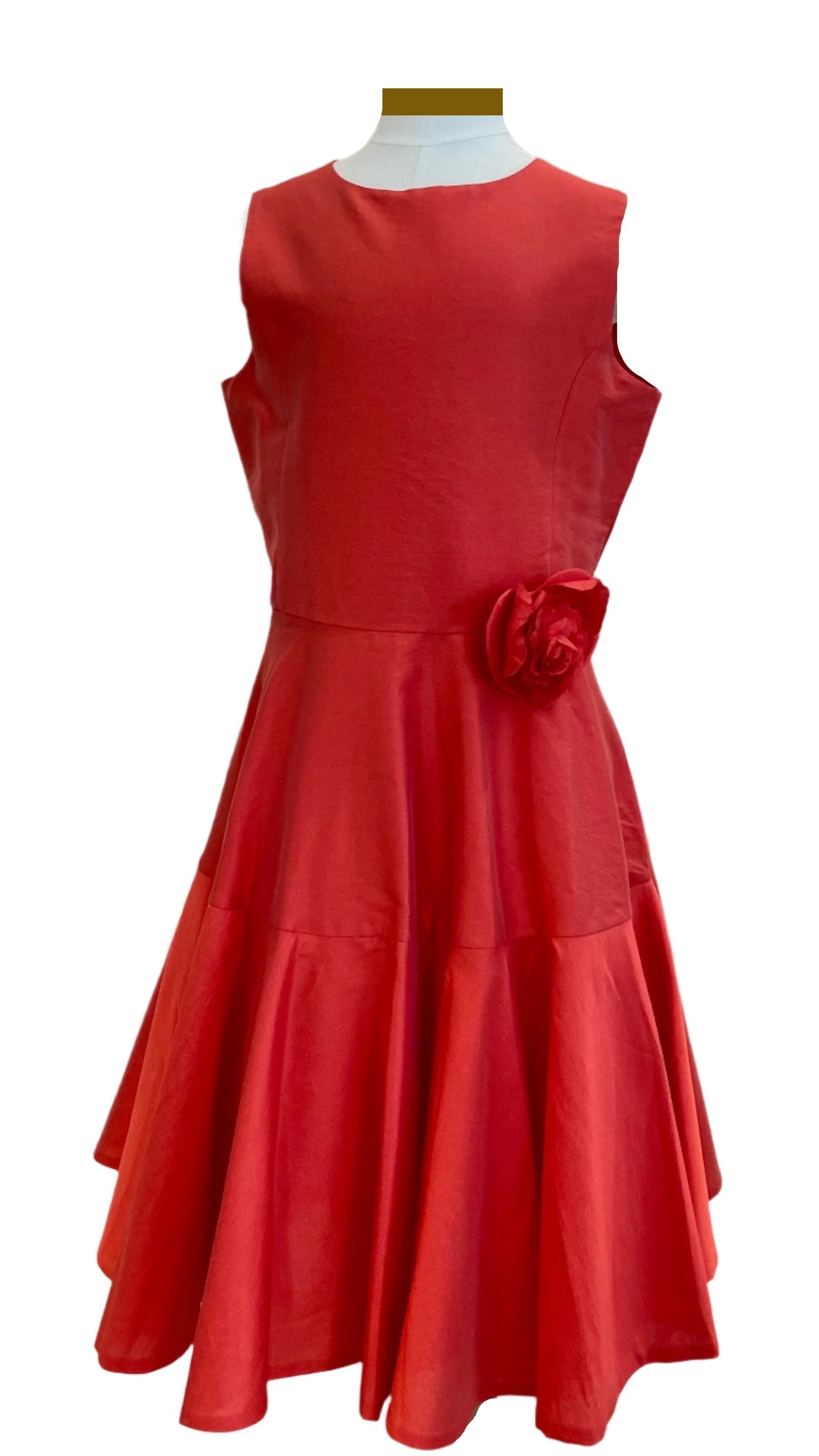 Gorgeous red seam dress from Elsy. Pleated skirt, zip fastening. This dress comes with a matching floral brooch.