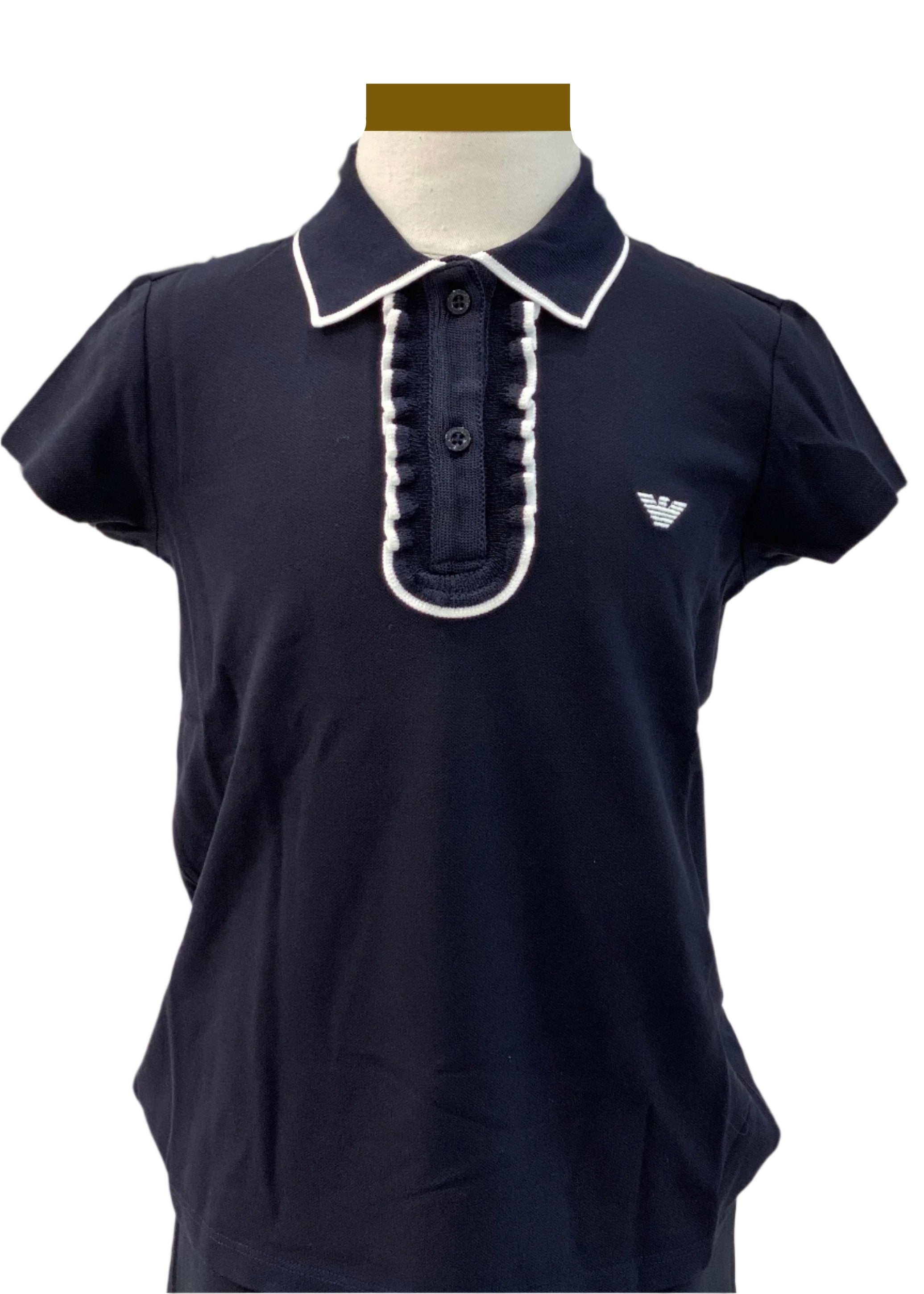 Navy Blue soft girls' polo shirt with ribbed collar and embroidered white eagle logo on the chest. It has a branded buttons to fasten at the neck with ribbed ruffles.