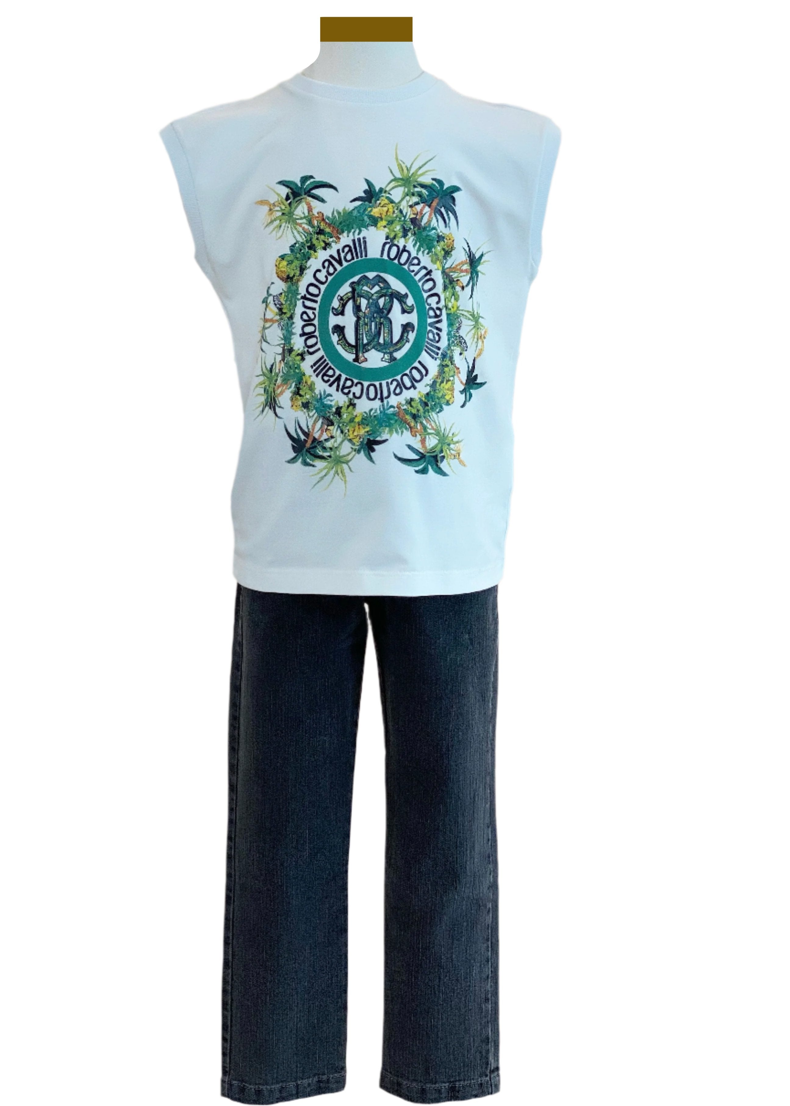 Casual outfit set featuring a semi-sleeveless top that has a ribbed neckline and sleeves. A jungle prints in circular shape and the brand logo name on the center. It is matched with a faded black denim jean that has a brand logo embroidery on its back pocket.