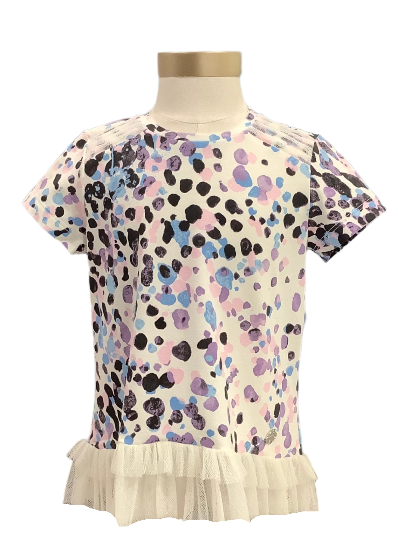 An all over printed blouse with two-layer ruffles at the bottom. It is also designed with white pleated mesh fabric on both shoulders. A product of Roberto Cavalli from Italy.
