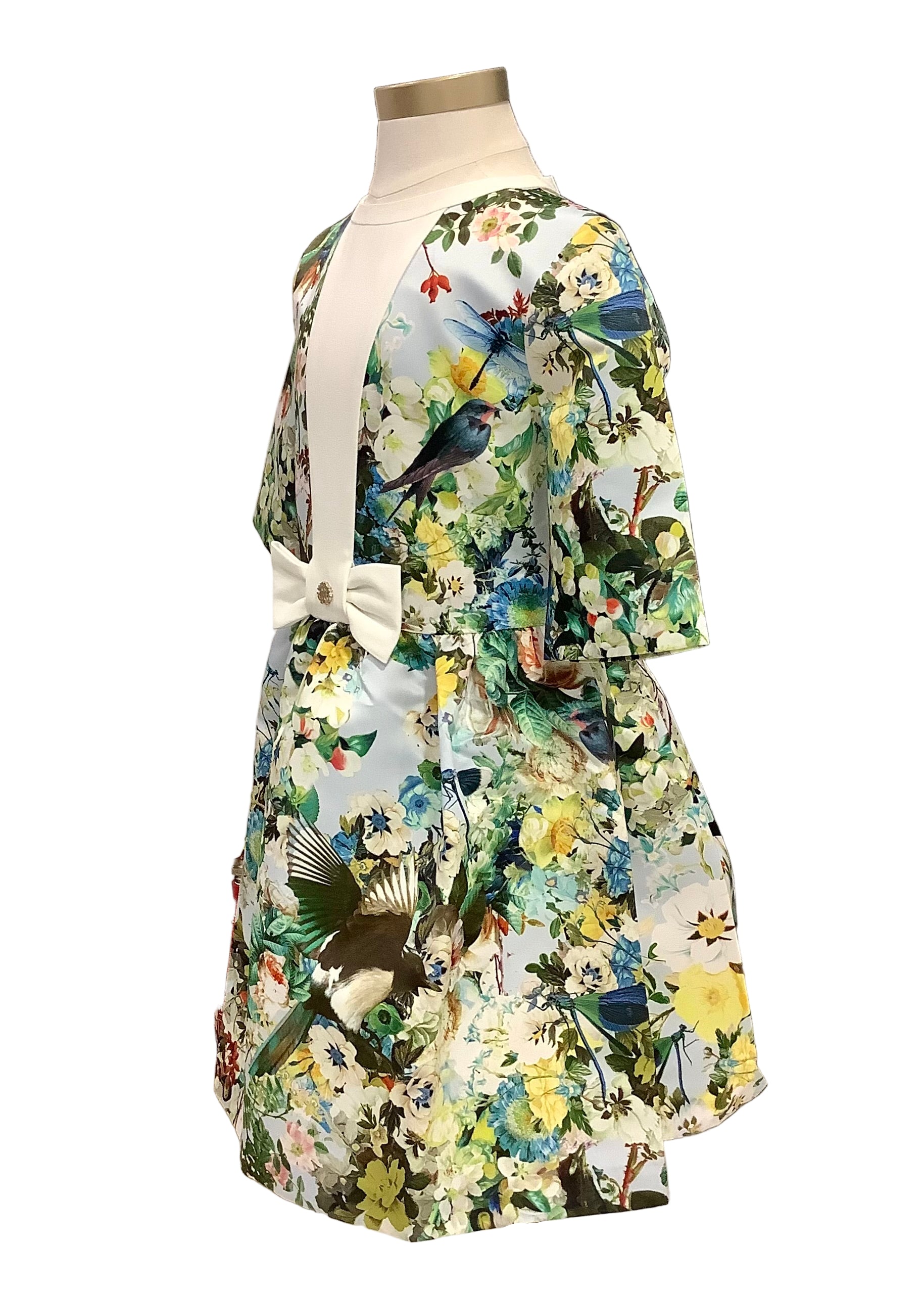 A sophisticated designer dress from the Italian brand Roberto Cavalli. It has a white crepe peter pan collar, a white ribbon bow on the center with a silver logo stud and an all-over garden print. This dress features puffed skirt for a more glamorous look.