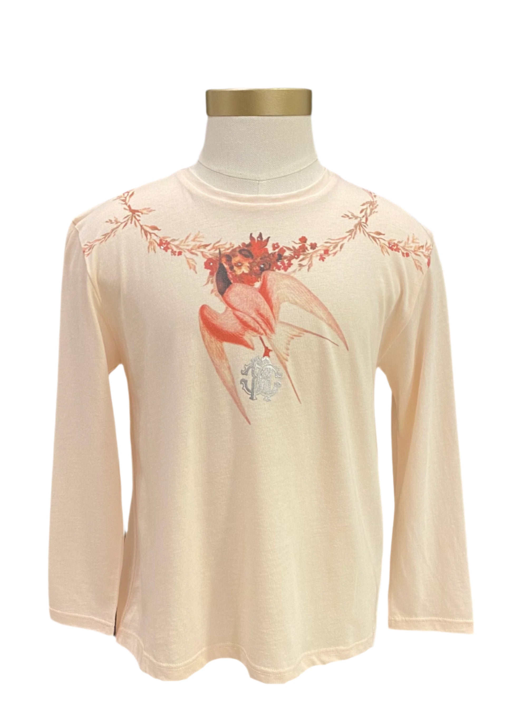 A pink long sleeve t-shirt by Roberto Cavalli. Flowers and bird prints designed at the front . It has a silver brand logo and crystals.