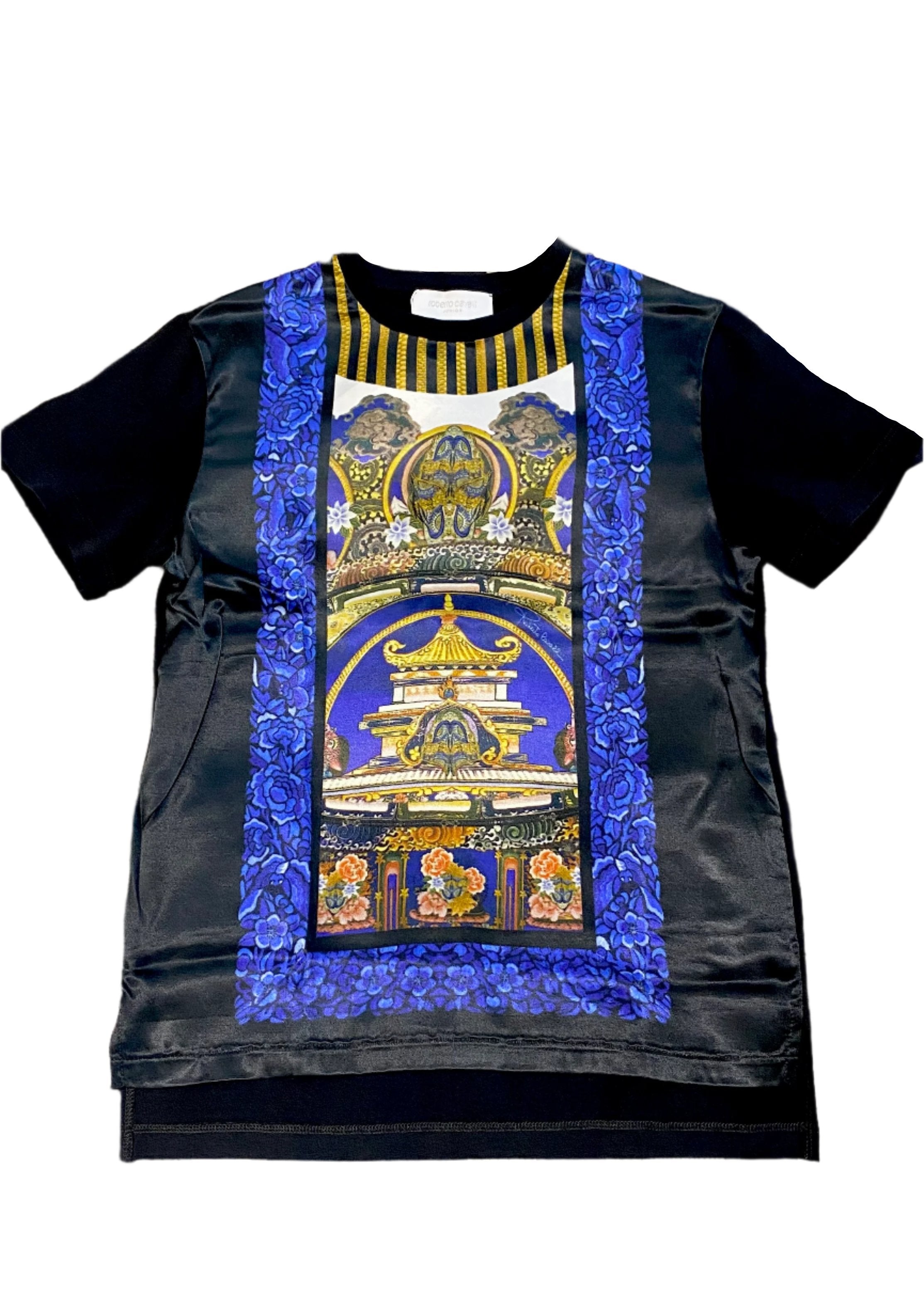 Long back top, with print design on the front in satin fabric. It has round neck and short sleeves. It is soft and comfortable to wear. A product of Roberto Cavalli from Italy.
