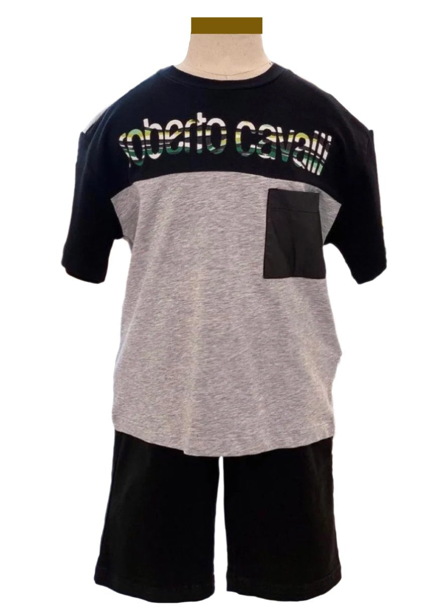 High quality brand outfit for boys. This set comes with a short sleeve, round neck t-shirt designed with 'roberto cavalli' print across the chest and a pocket. The top is match with bermuda short that has two pockets on the front and a false pocket at the back, finished with 'RC' logo emblem at that back of the waist.