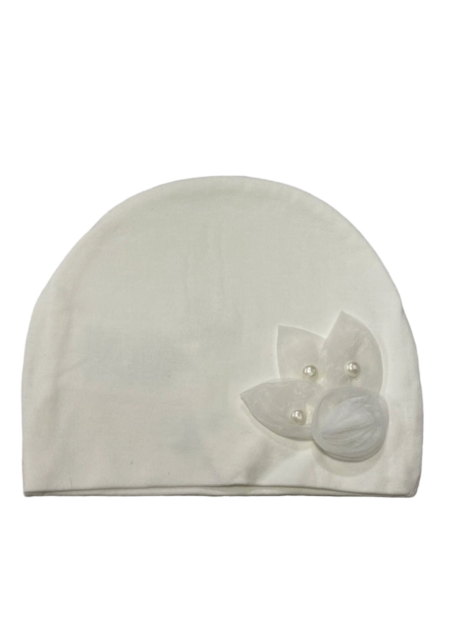 Adorable baby cotton hat. It is lovely designed with rose with petal applique in organza fabric, finished with pearl details. Soft and comfortable to wear.