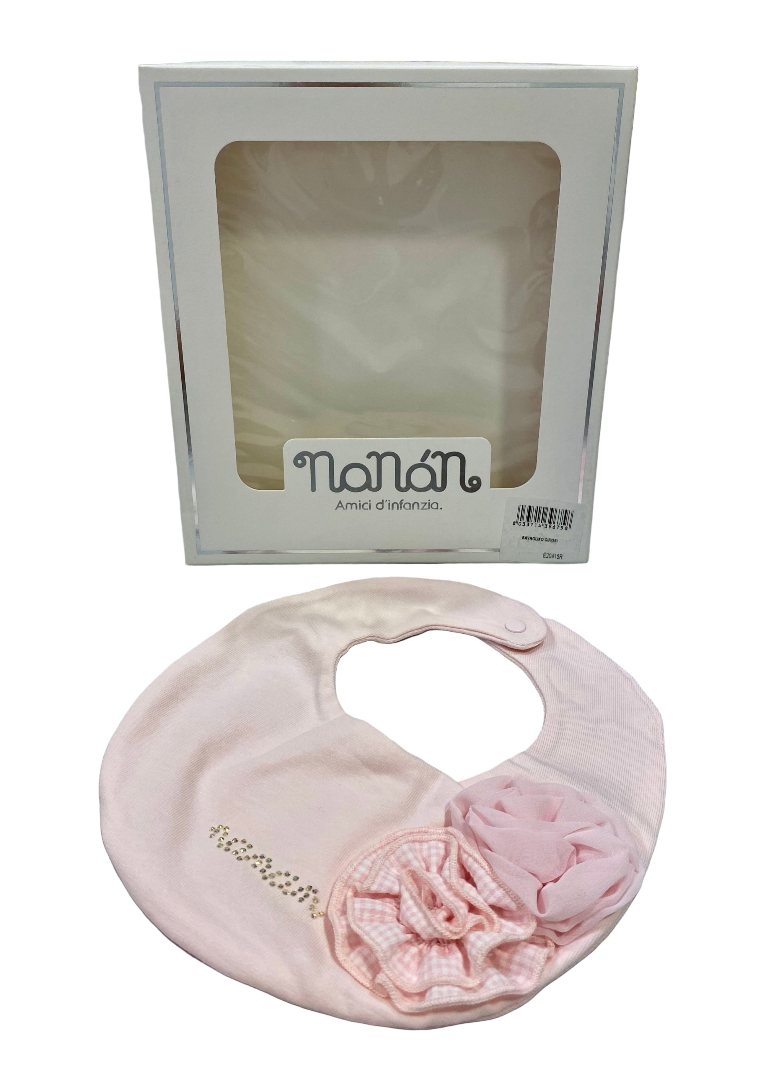 Beautiful baby girl bib. Embroidered with roses applique in checkered pattern print and organza fabric, finished with brand name writing in crystal bead.