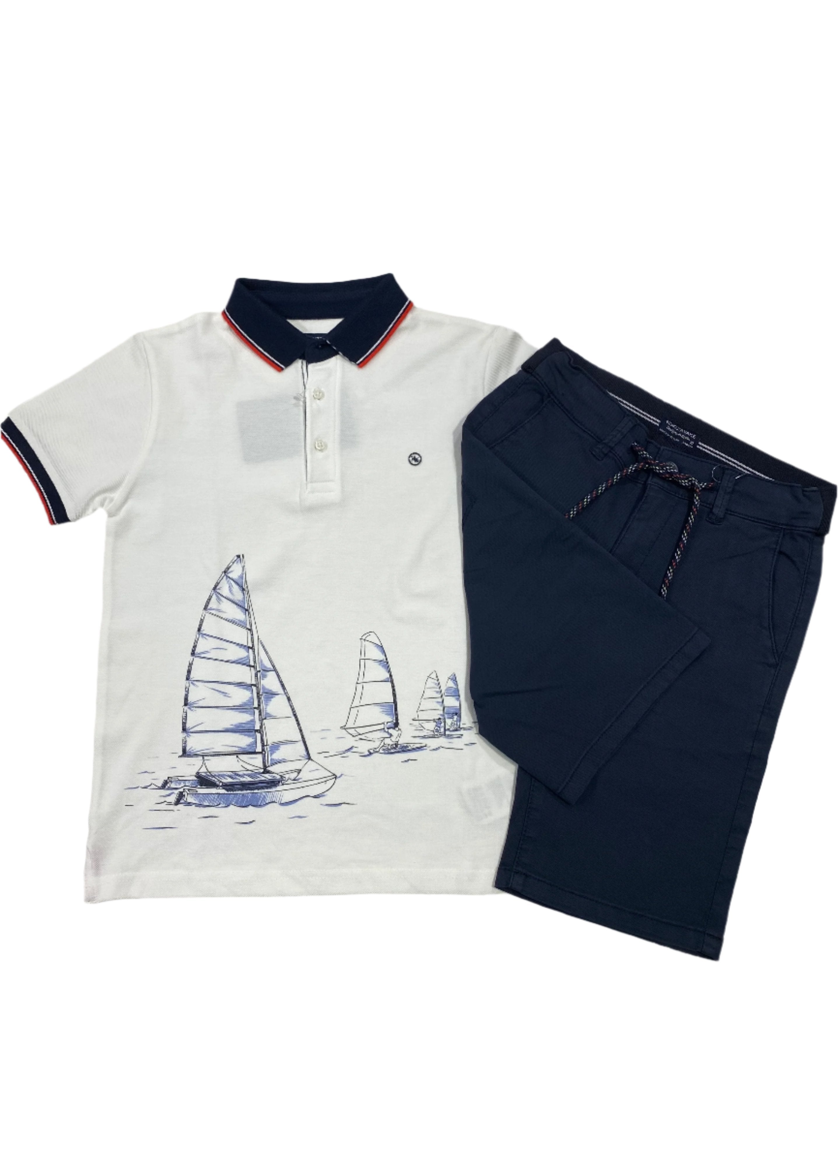 Polo shirt is made of cotton, textured jersey. Contrast knit on the sleeves and contrasting color of the lower part of the collar with saling design. Shorts has a belt loops, elasticated waistband and has drawstring with two side and back pockets.