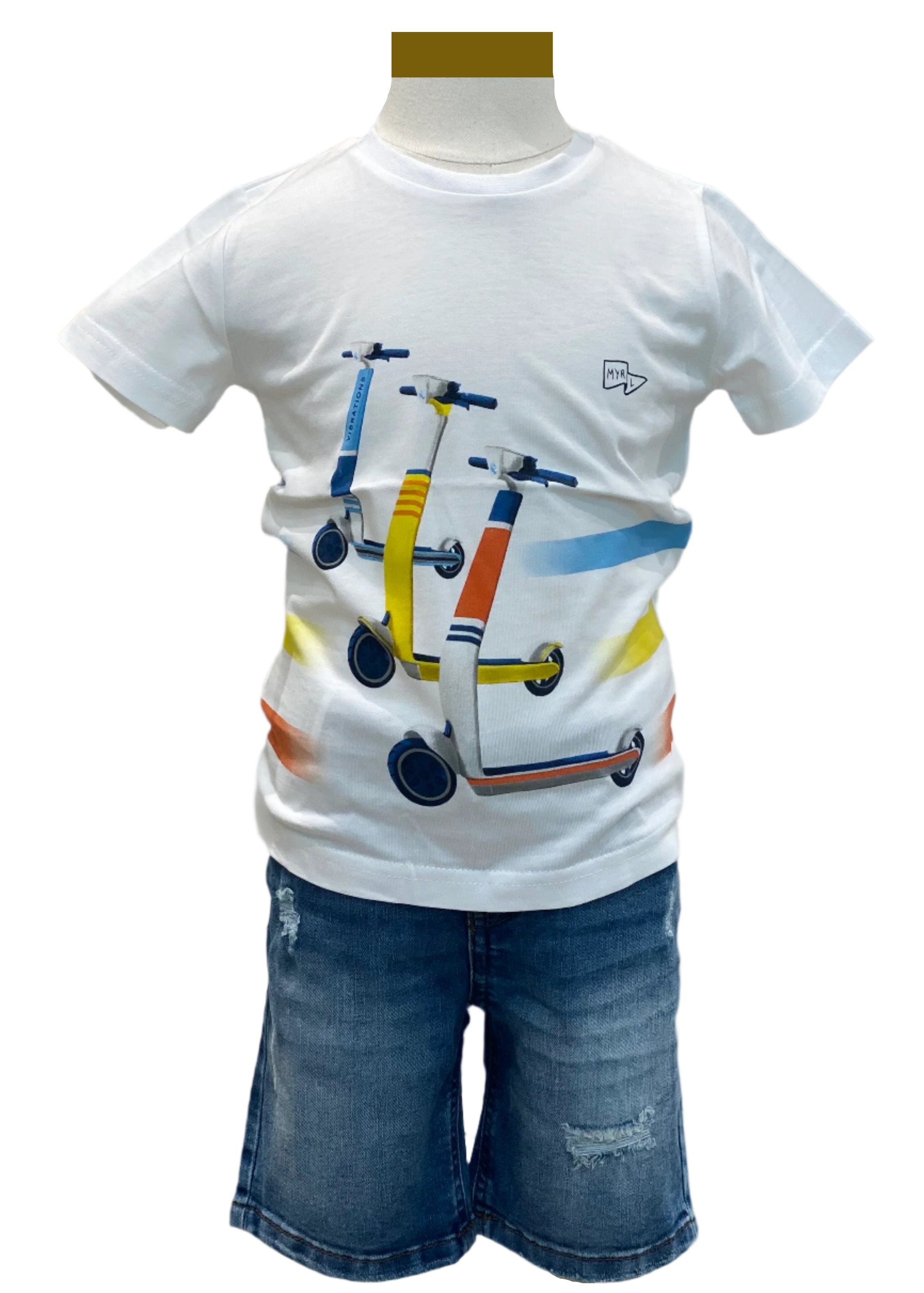 A set of casual outfits for boys. This comes with a round neck, soft t-shirt that has scooters print as a design, and a semi-rugged denim short.