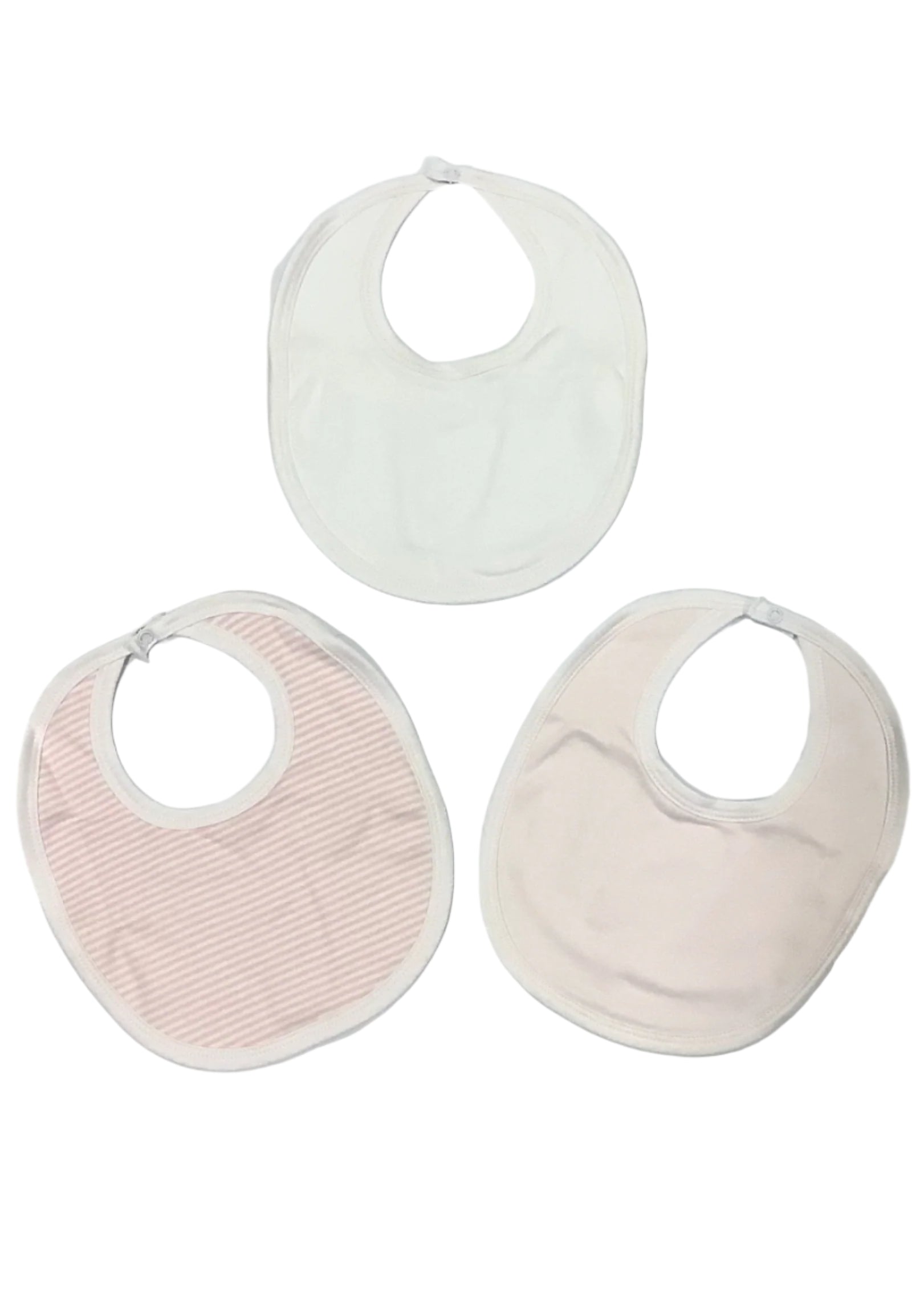 Double thickness bib, designed with pink and white plain and stripes. White color in reverse. Secured with popper.