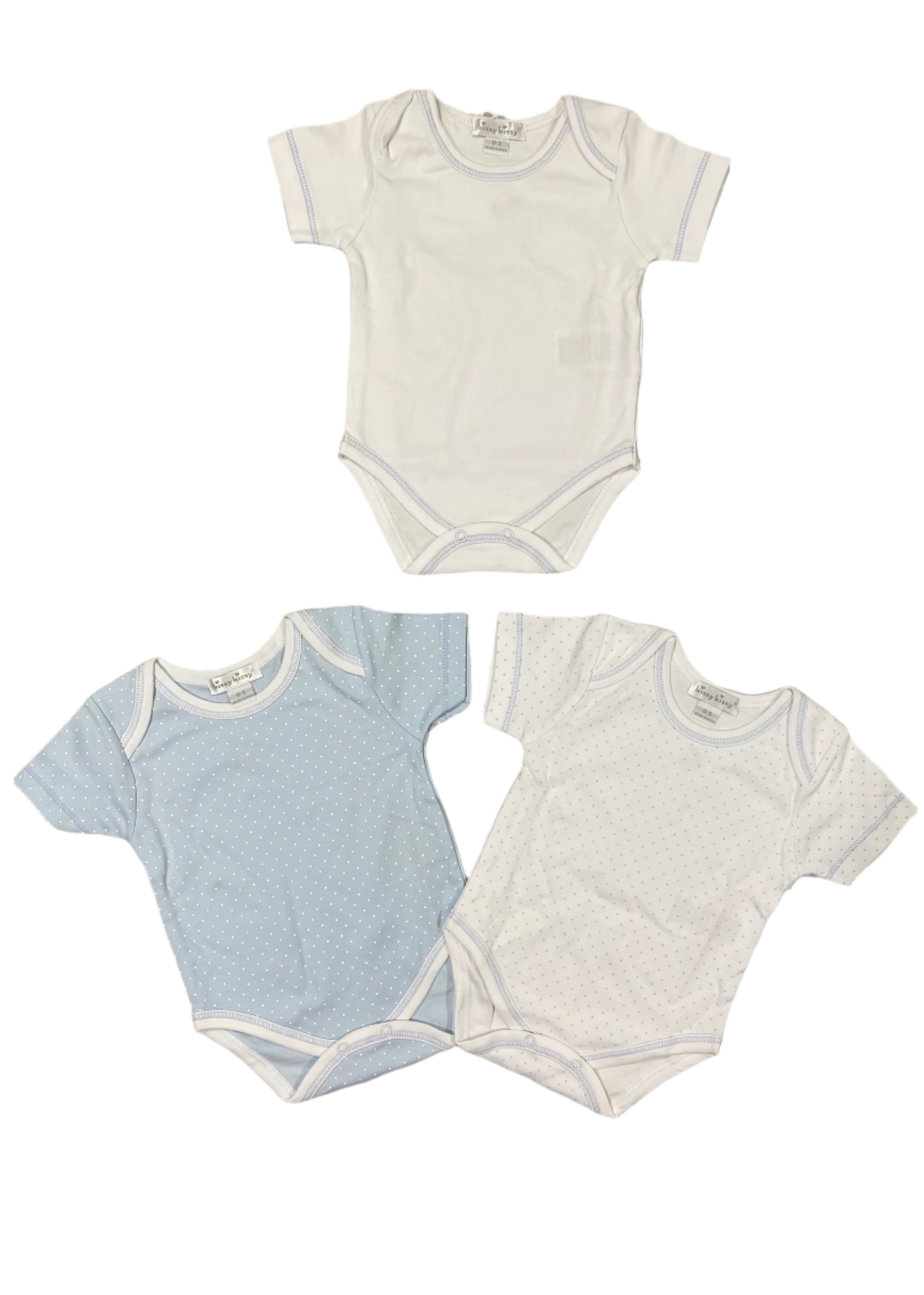 Adorable 3pc baby boy bodysuit. Has plain and mini dots design. Snap button in between legs.