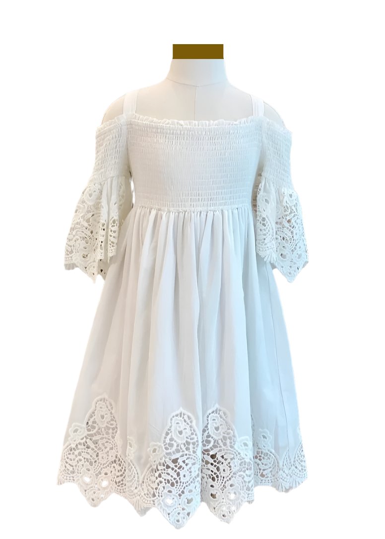 Made of soft cotton fabric. Shirred dress has off shoulder, embroidered sleeves and hem.