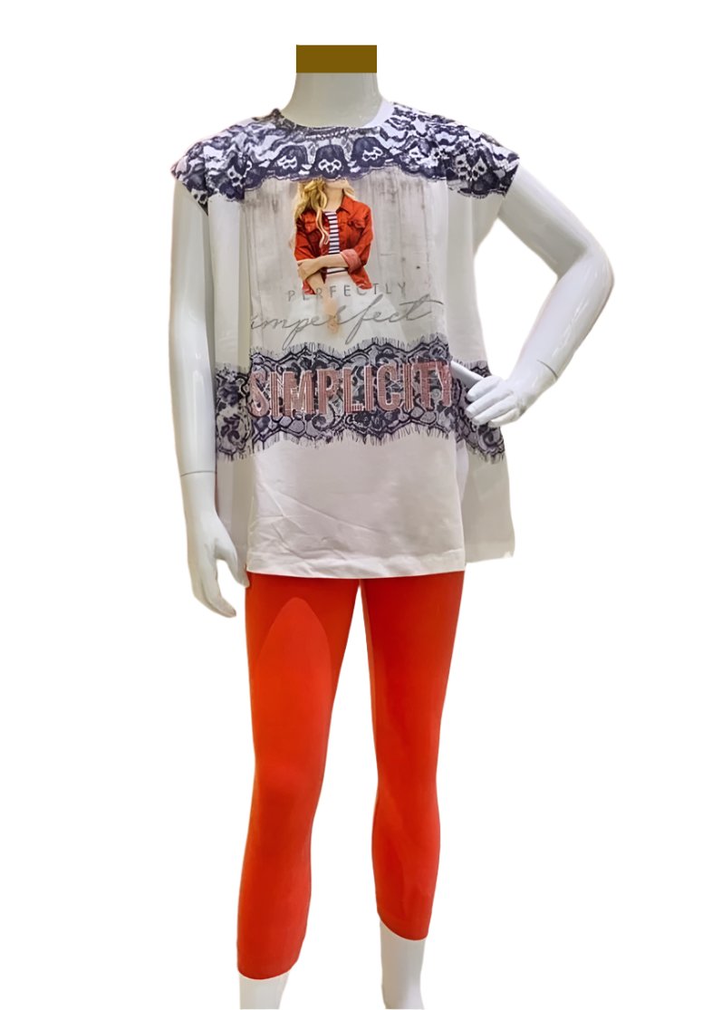Pretty girl outfit. This set comes with a short sleeve blouse with wide cut design with 'Simplicity' in red studs. The top is matched with a long leggings with elasticated waistband. Comfortable to wear.