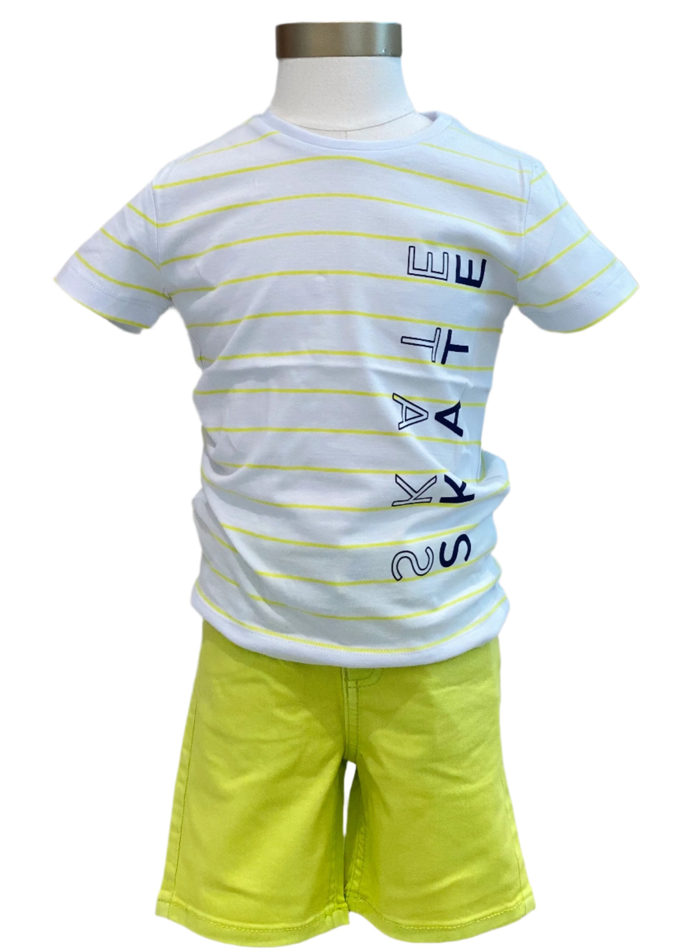 A set of round neck, stripe t-shirt with 'Skate' writing print and a matching denim short.