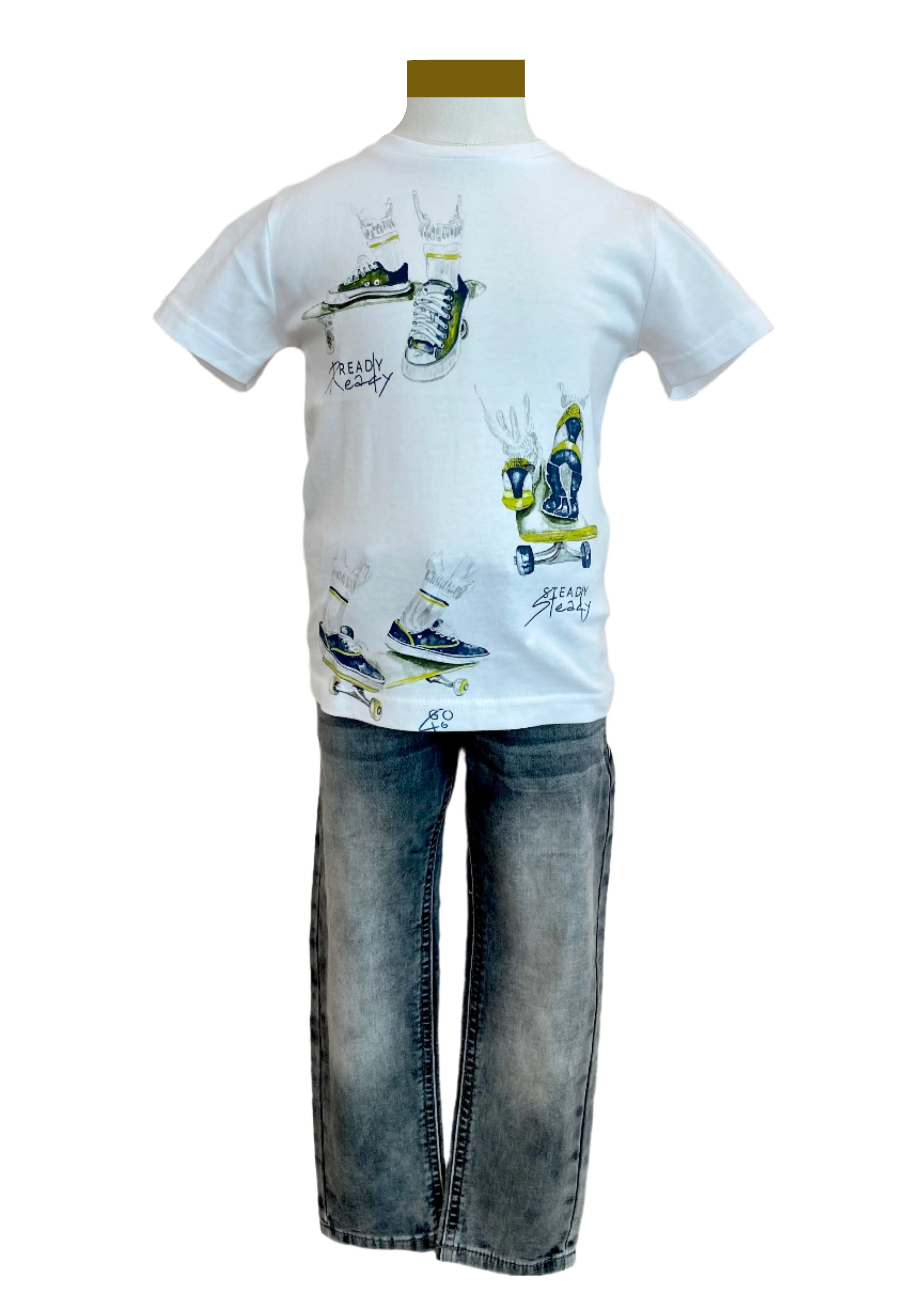 A set of top pants set from Mayoral. This set comes with a round neck t-shirt printed with skater and a washed denim jean. Casual outfit for boys.