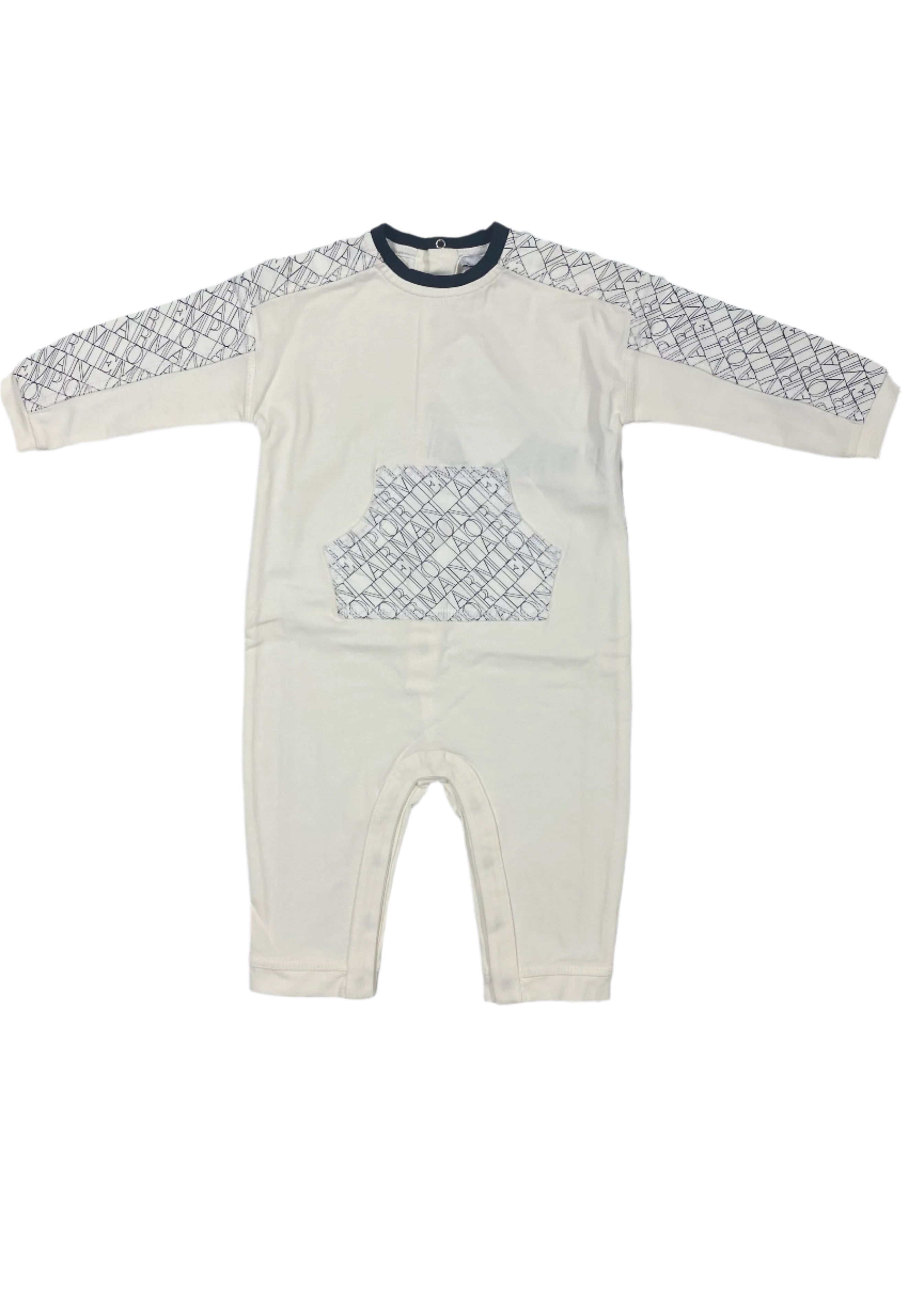 Made with soft cotton fabric. Has 'Emporio Armani' print pattern on the sleeve and shoulder with front pouch pocket. Has snap button fastening at the back and in between legs for easy dressing. Comfortable to wear.