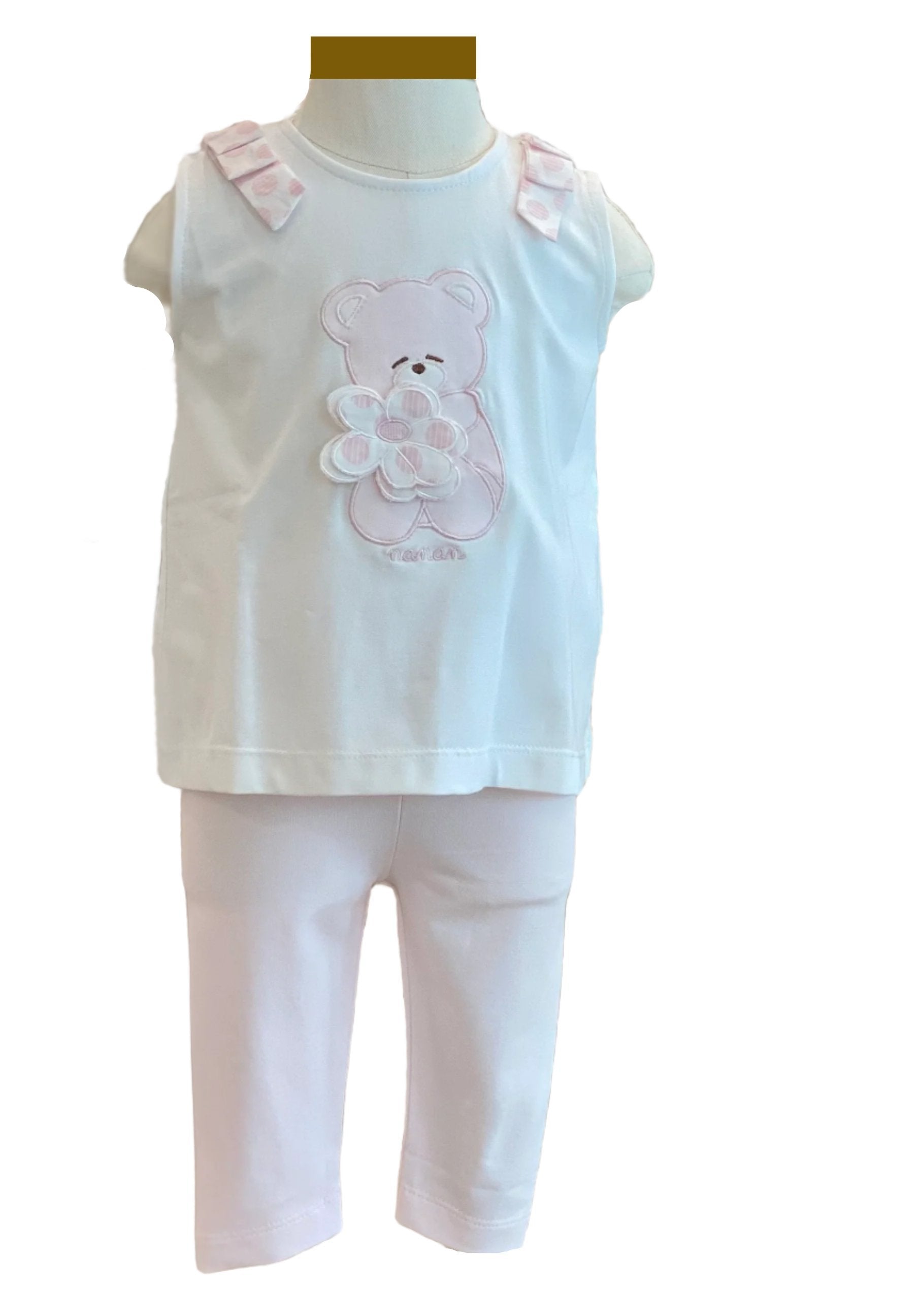 Cute leggings set for baby girl. This comes with a sleeveless top designed with bear embroidery and floral applique, finished with ribbon applique on the shoulder. It also comes with a matching soft legging.