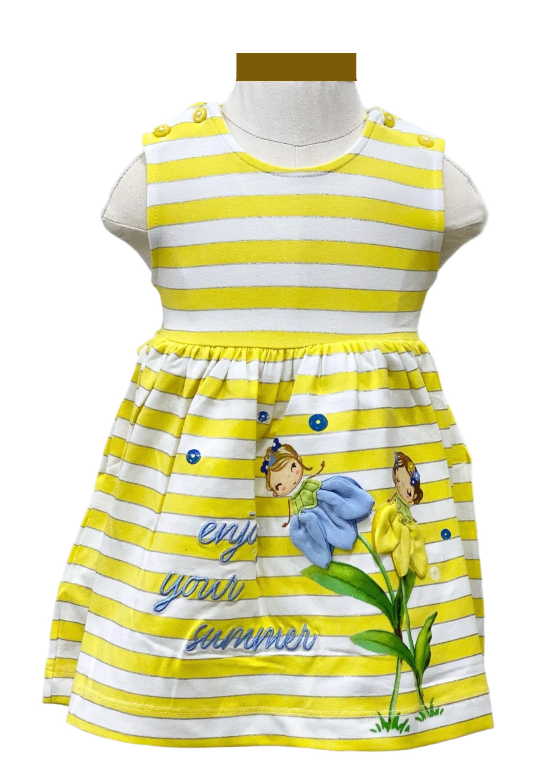 Soft, sleeveless stripe cotton dress. Cross-back strap with button closure on both shoulders. Designed with girls print and writing embroidery.