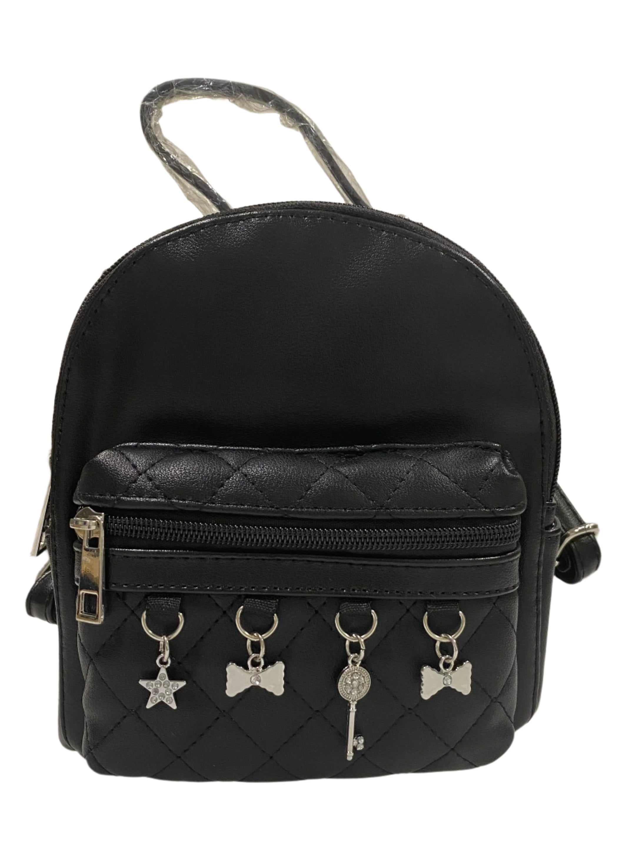 Made with soft eco-leather. This small black backpack features 2 compartments and has metal silver zirconia. Adjustable strap.