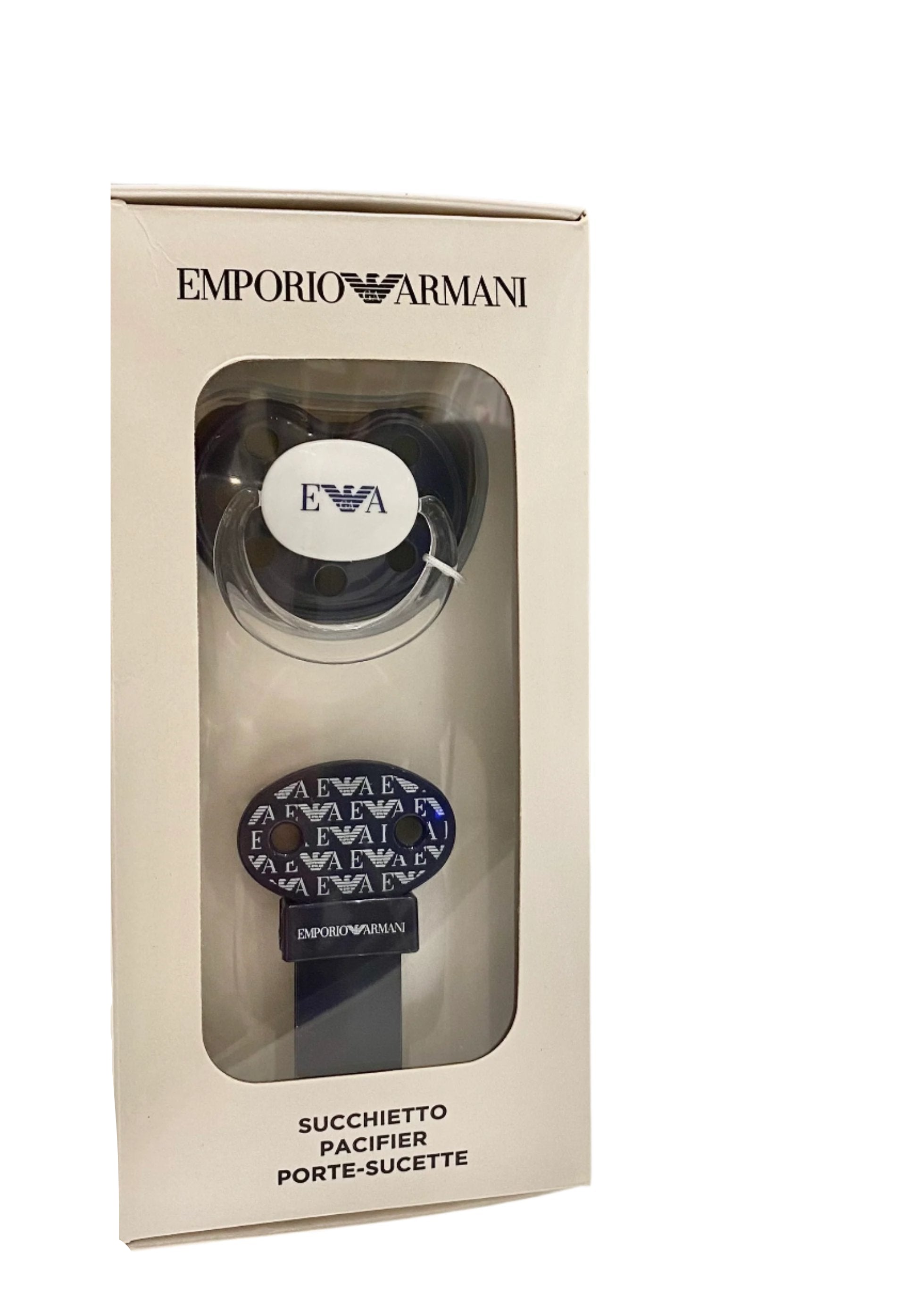 A set of soother and strap with clasp. Strap is designed with stipe pattern.