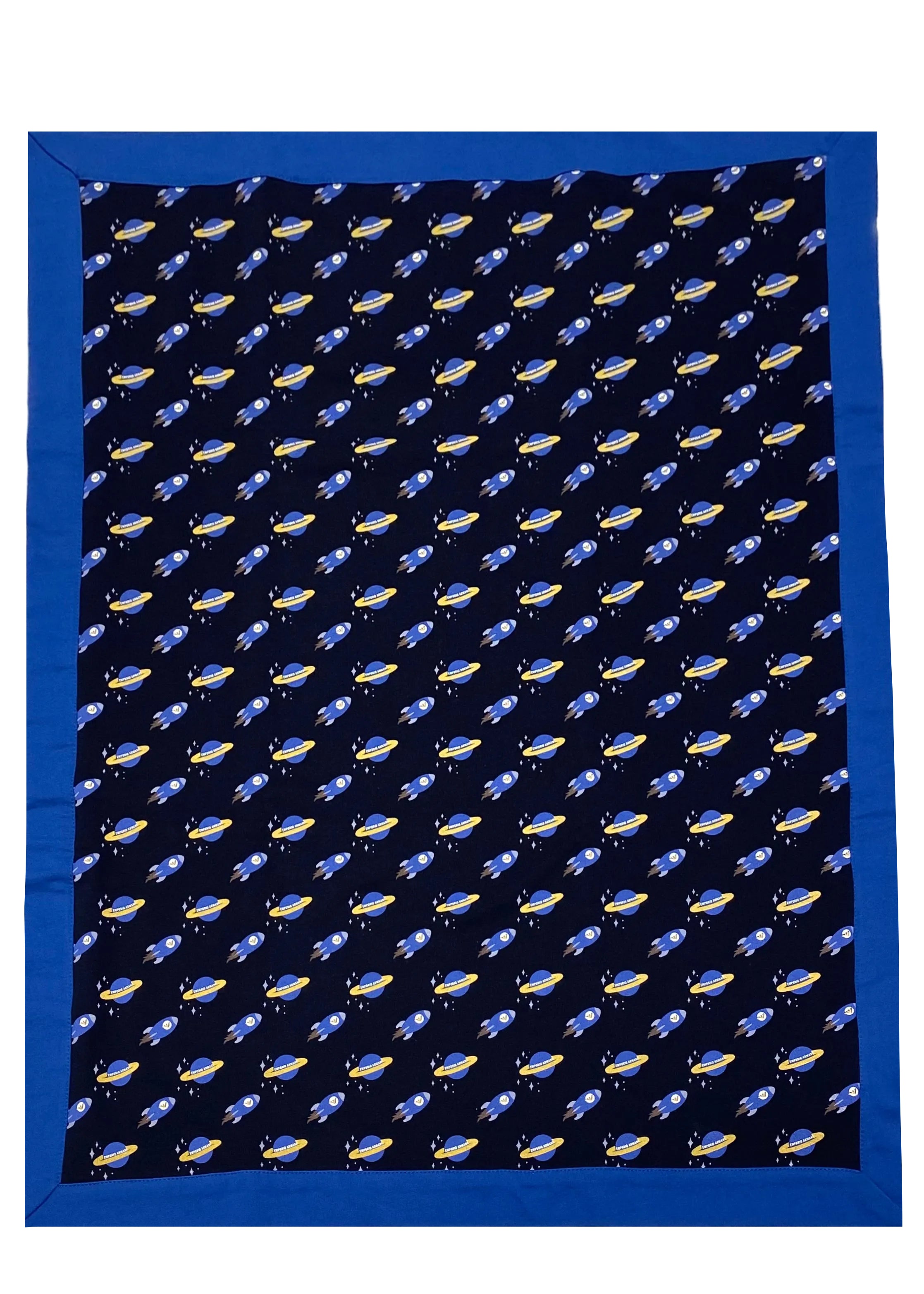 Soft, comfortable baby blanket. Designed with space theme print. Finished with blue trim around the edge.