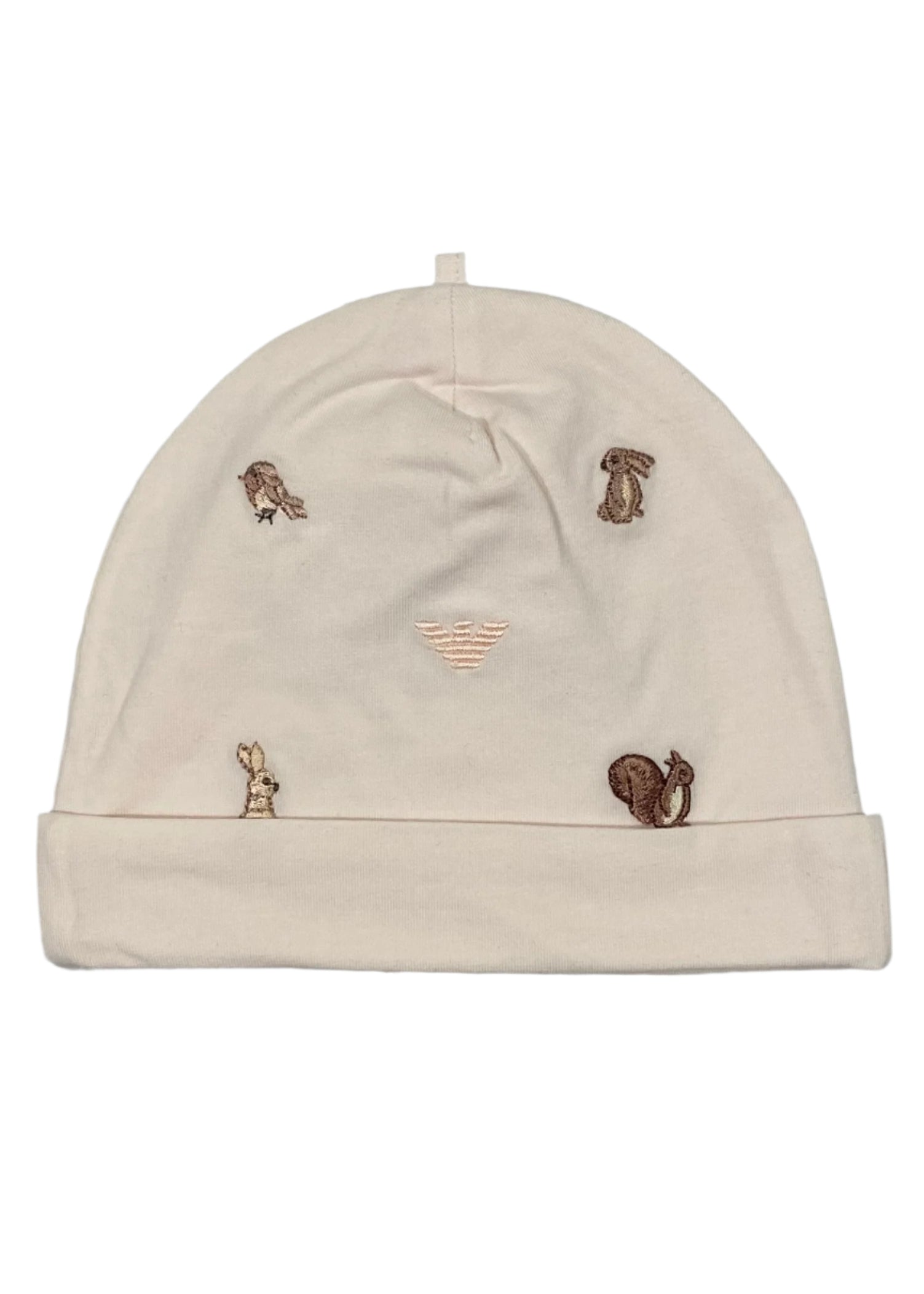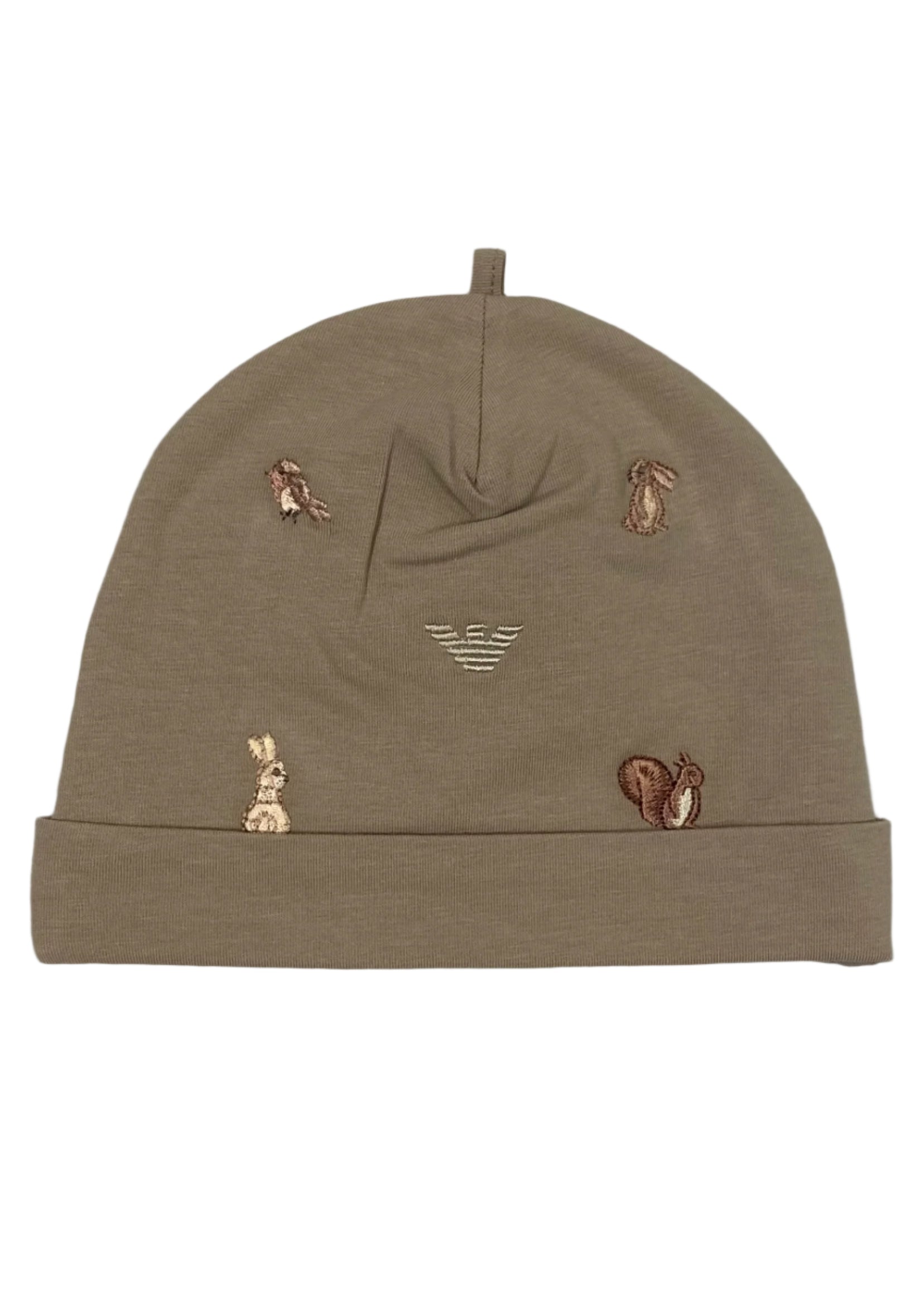 Made with cotton jersey for a comfortable wear. Designed with squirrel embroidery and Armani Eagle logo, finished with fold-up brim.