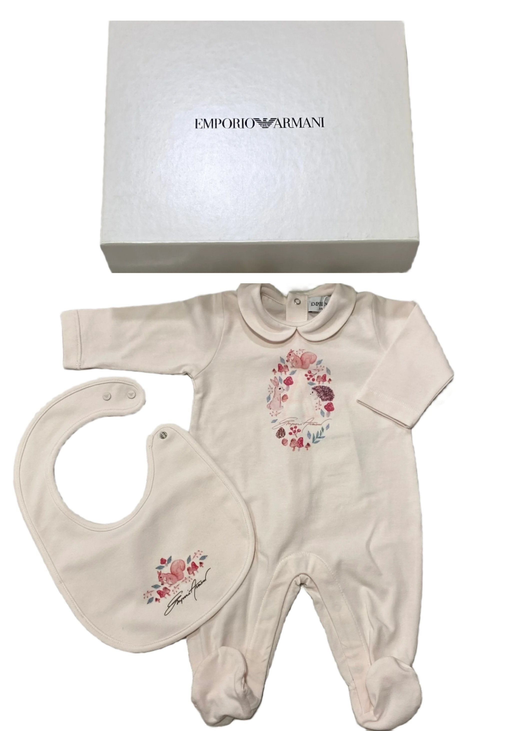 A perfect gift set for a newborn baby girl. This set comes with an overall designed with squirrels and hedgehog print, snap button fastening at the back and in between legs. This overall also comes with a matching soft bib. This gift set comes with an 'EMPORIO ARMANI' box.