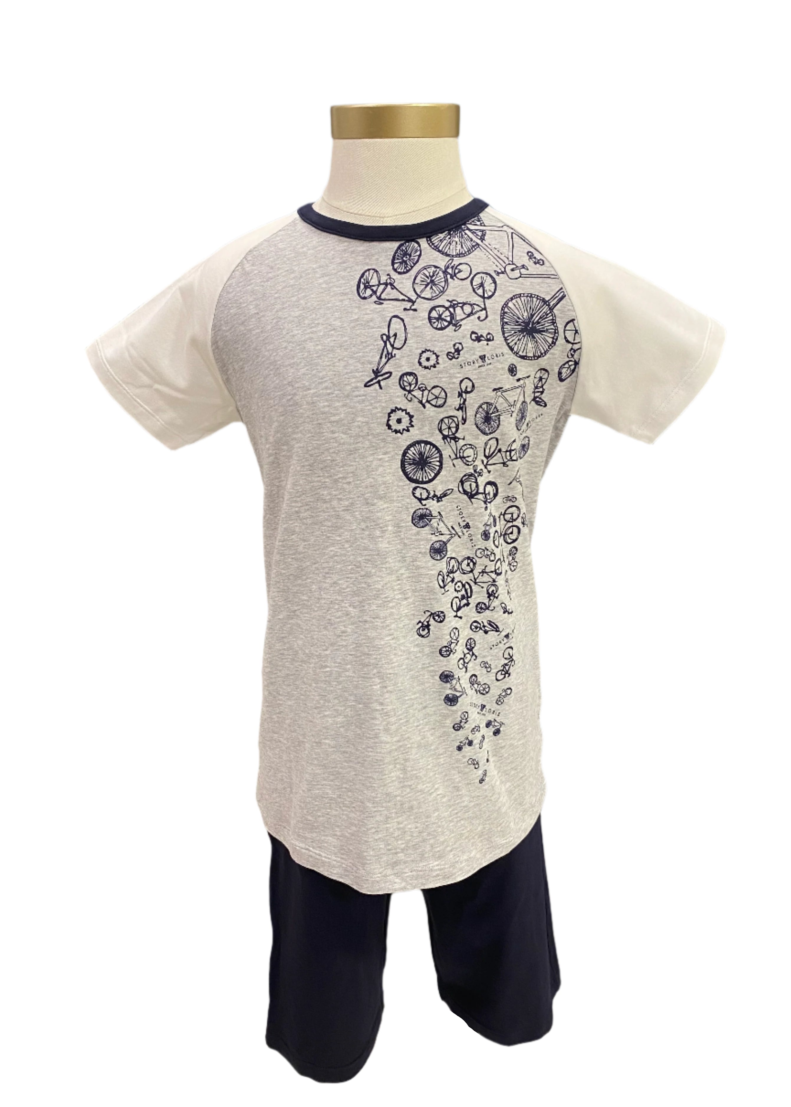 Set of soft pyjama from Story Loris. It comes with a round neck, short sleeves t-shirt printed with bicycle on one side. It is matched with a knee-length short with elasticated waistband.