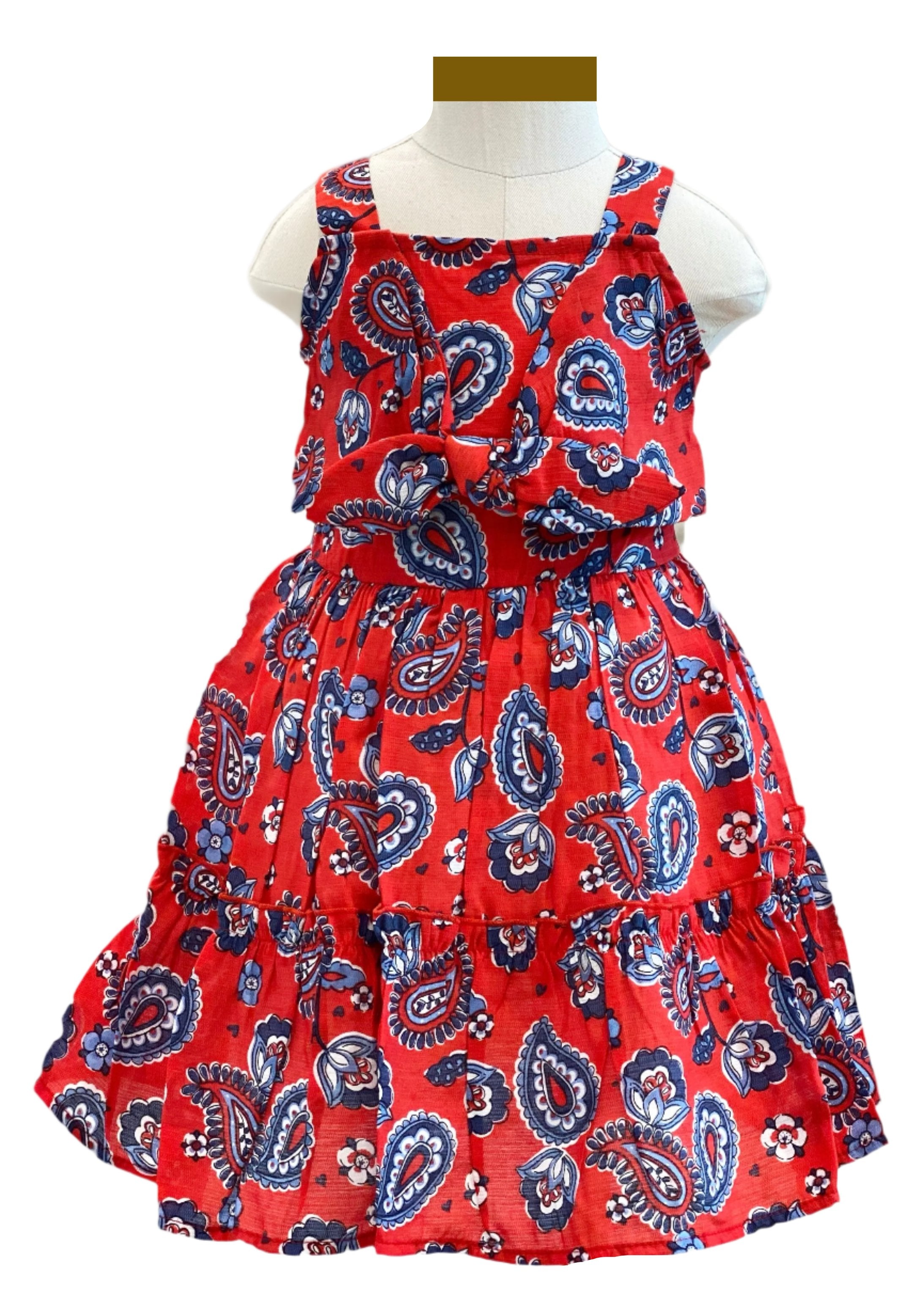 Adorable strap dress with bow on the chest and has pleats and ruffle design with smocking details on the back.