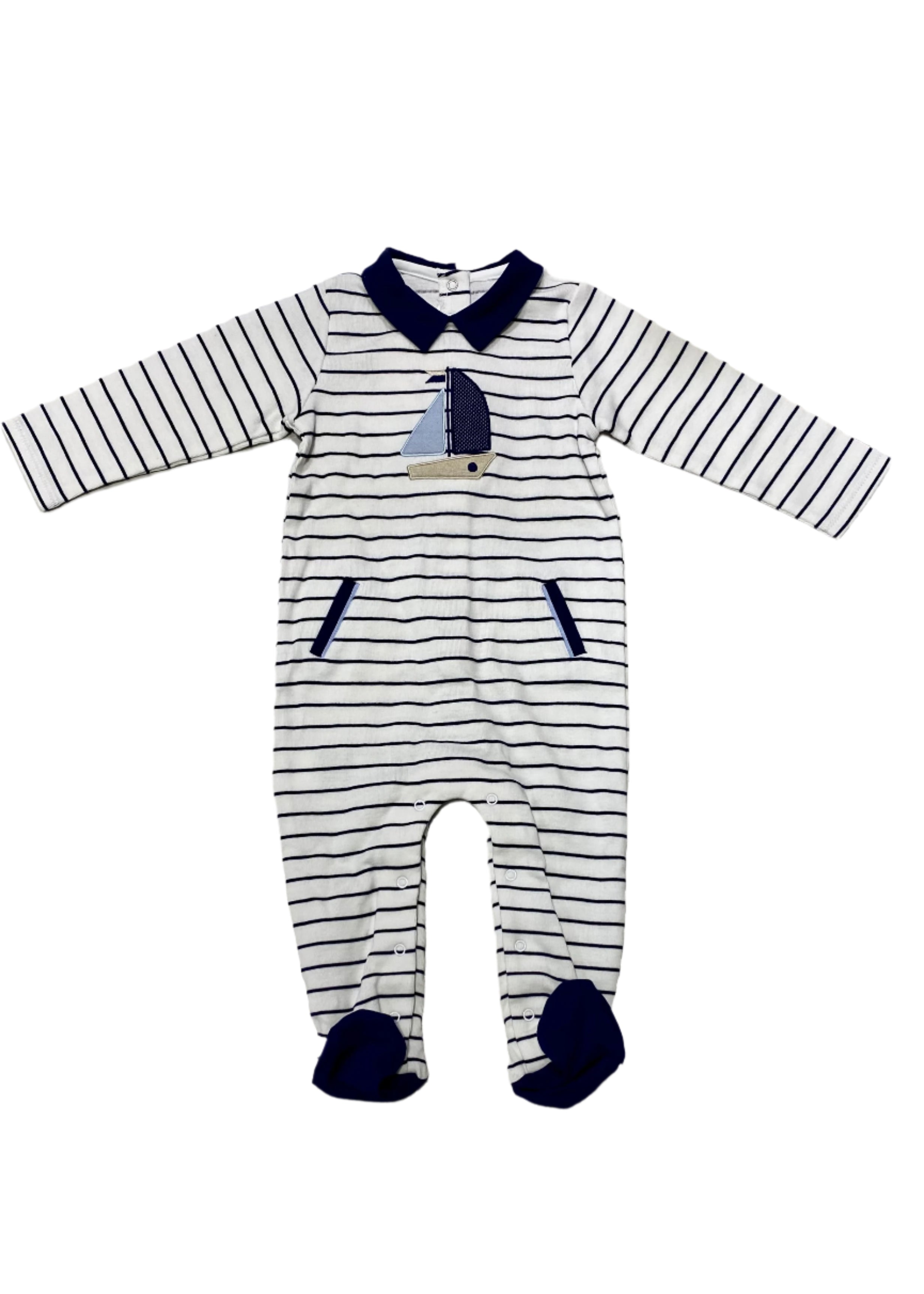One piece baby boy clothing. Stripe romper with classic cut collar and false pockets. embroidered with sailboat design. Snap button fastening at the back.