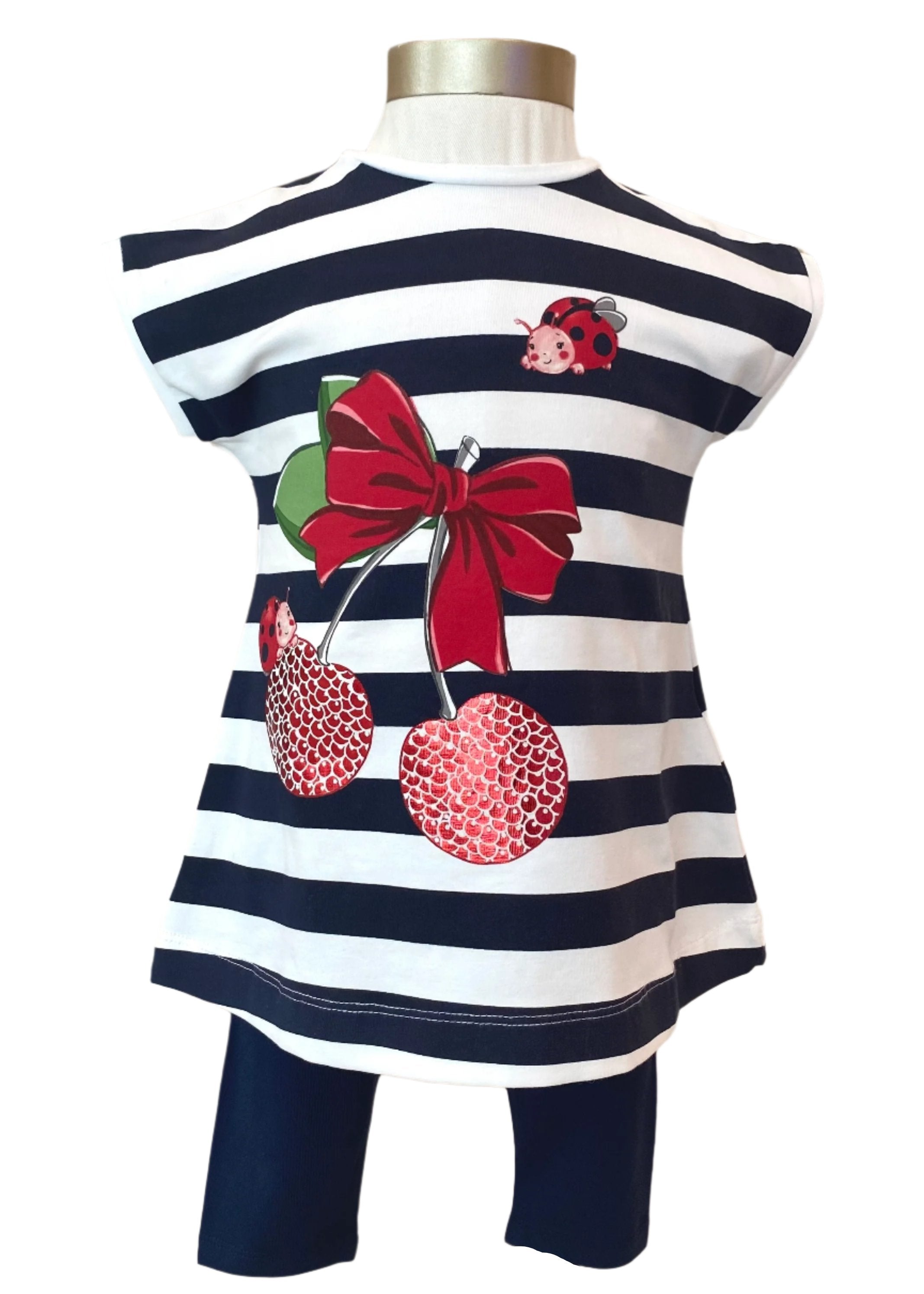 Soft and comfortable baby girl outfit. This set comes with a stripe pattern top, designed with cherry and bow print, and stretchy leggings set.