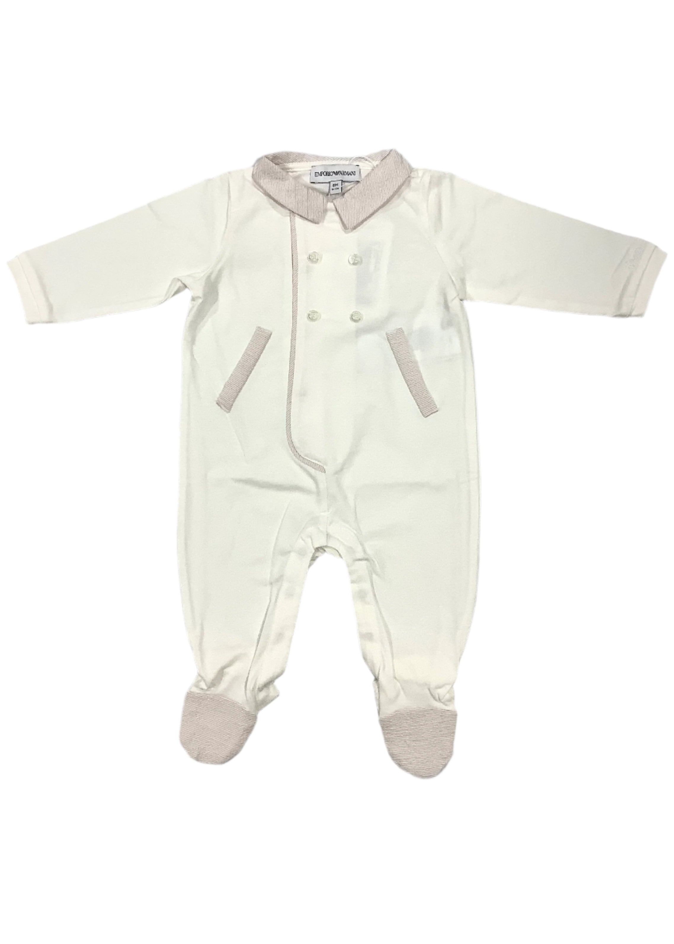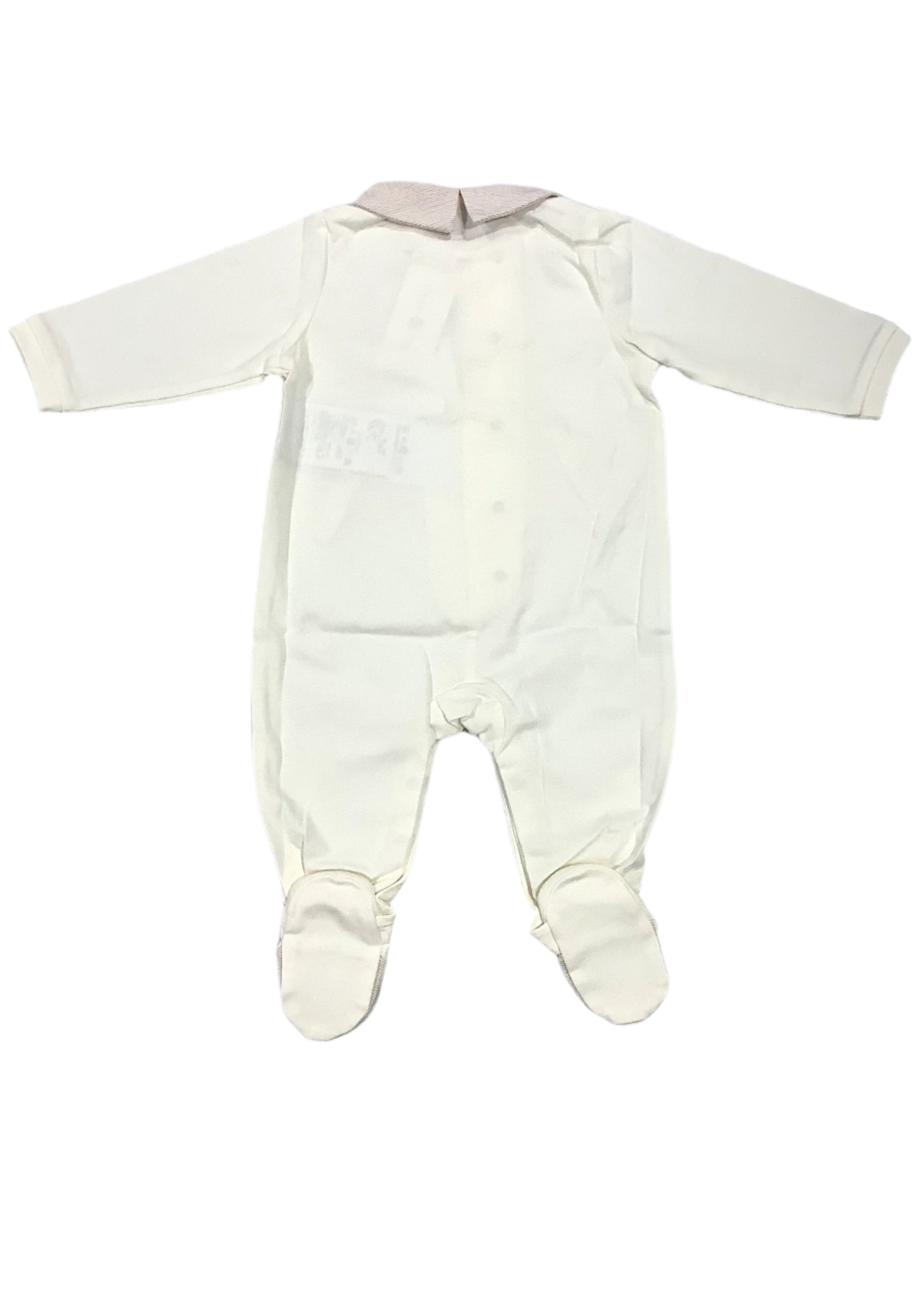An elegant yet comfy romper suit for your baby girl. It has tab collar, button design on the chest, an overlapping button snap closure on the front and in between legs, and has a false pocket on two sides, finished with brand logo embroidery on one sleeve.
