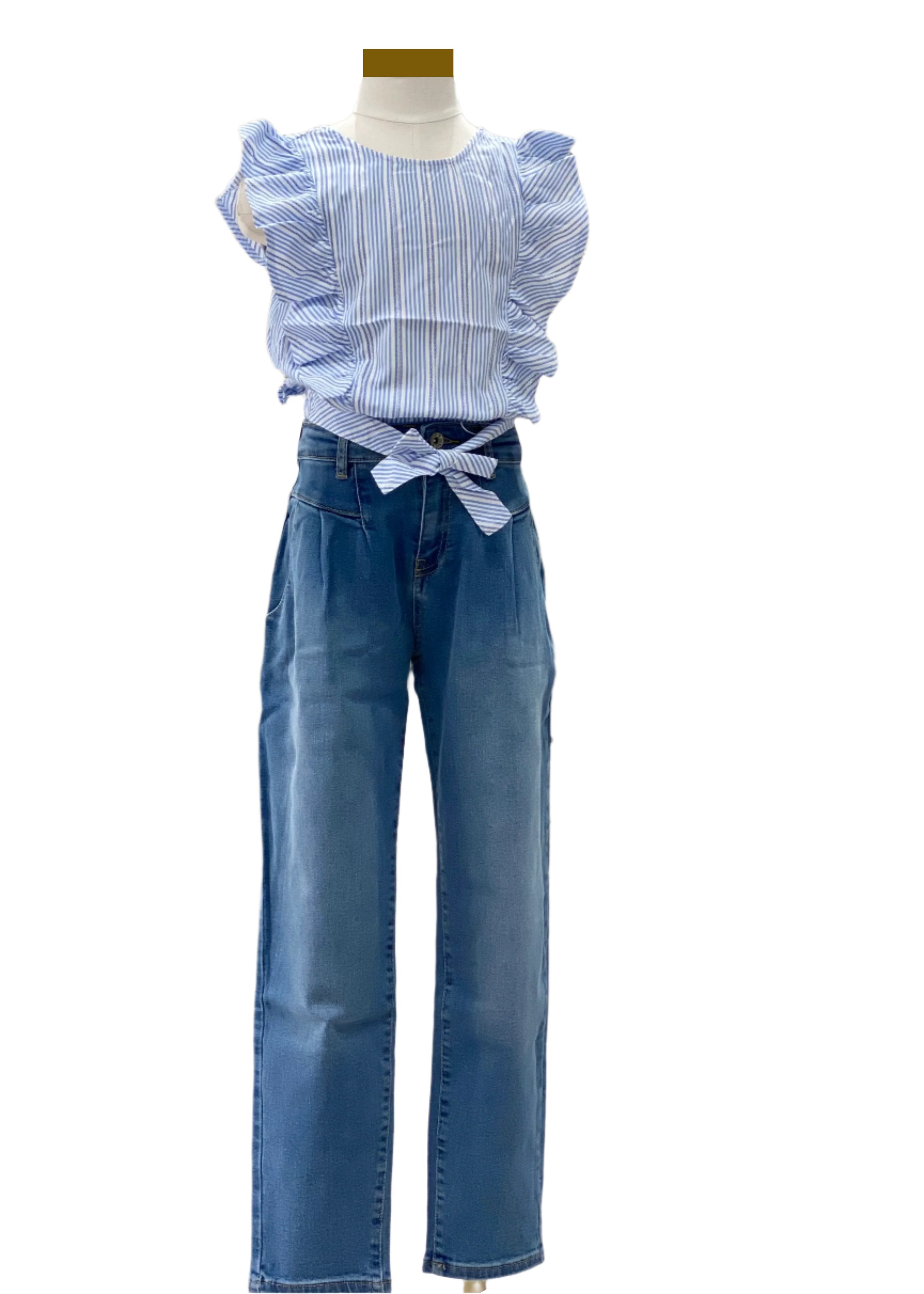 Stripe blouse with ruffled short sleeve with round front neckline and v-shape back neckline and has elasticated hem. Denim faded pants has four pockets, zipper and button for fastening.