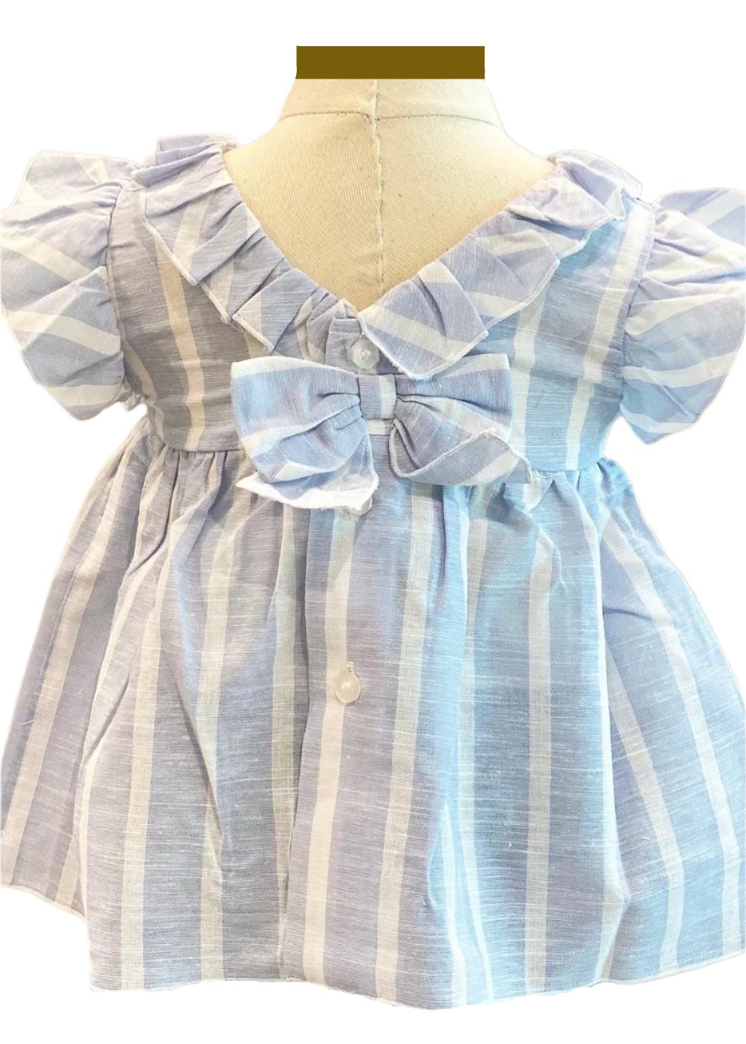 Chic, casual baby girl outfit. This comes with a stripe blouse with ruffle trim on the collar and sleeves. It is matched with a floral embroidery jean and a matching belt.