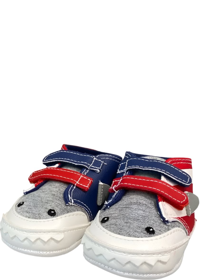 Shark-like designed shoes. Made with soft materials for comfortable wear. Velcro strap closure. Fun to wear.