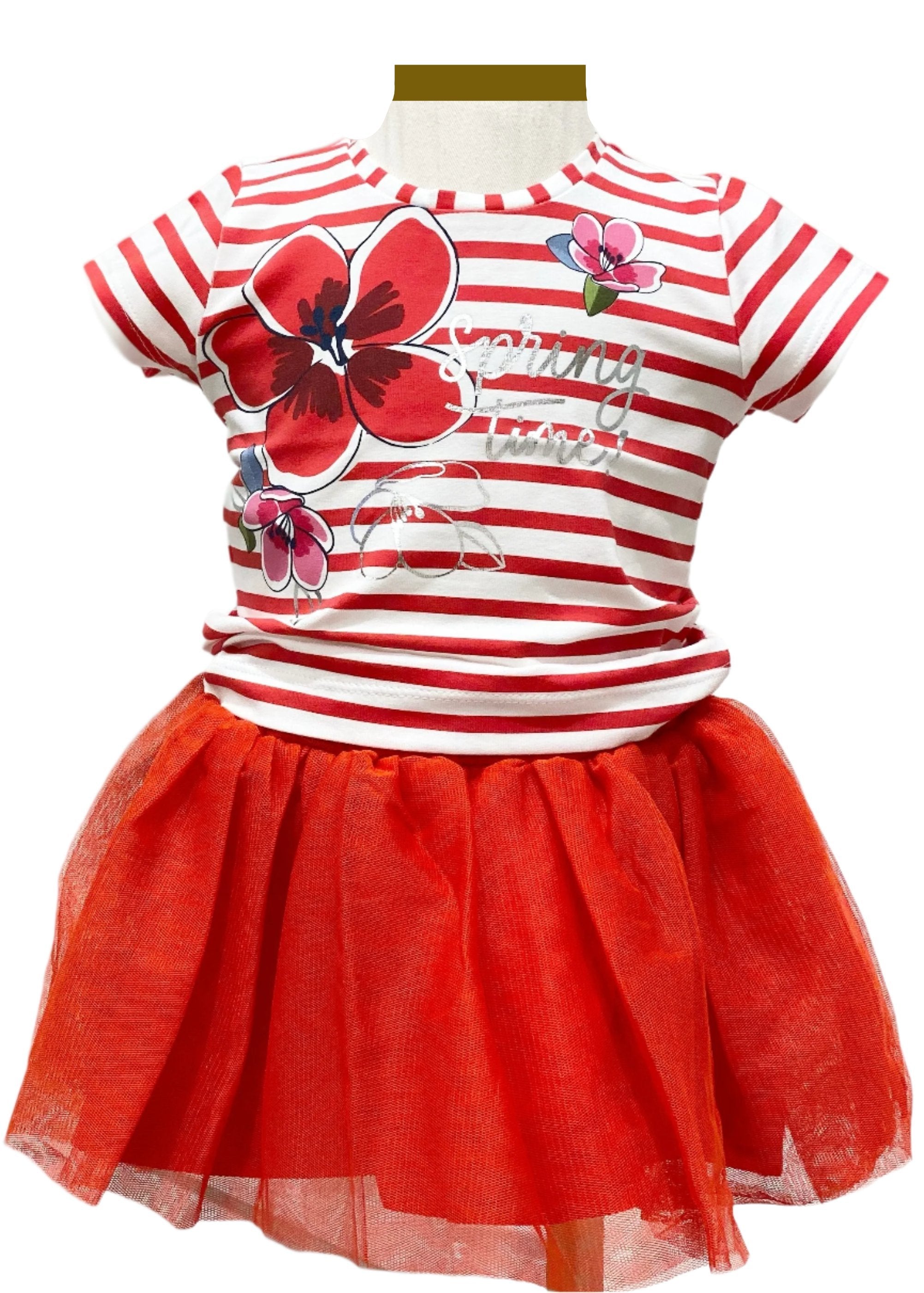 Lovely top and skirt set. Top has stripe pattern design and floral print, matched with a pretty red tulle skirt.