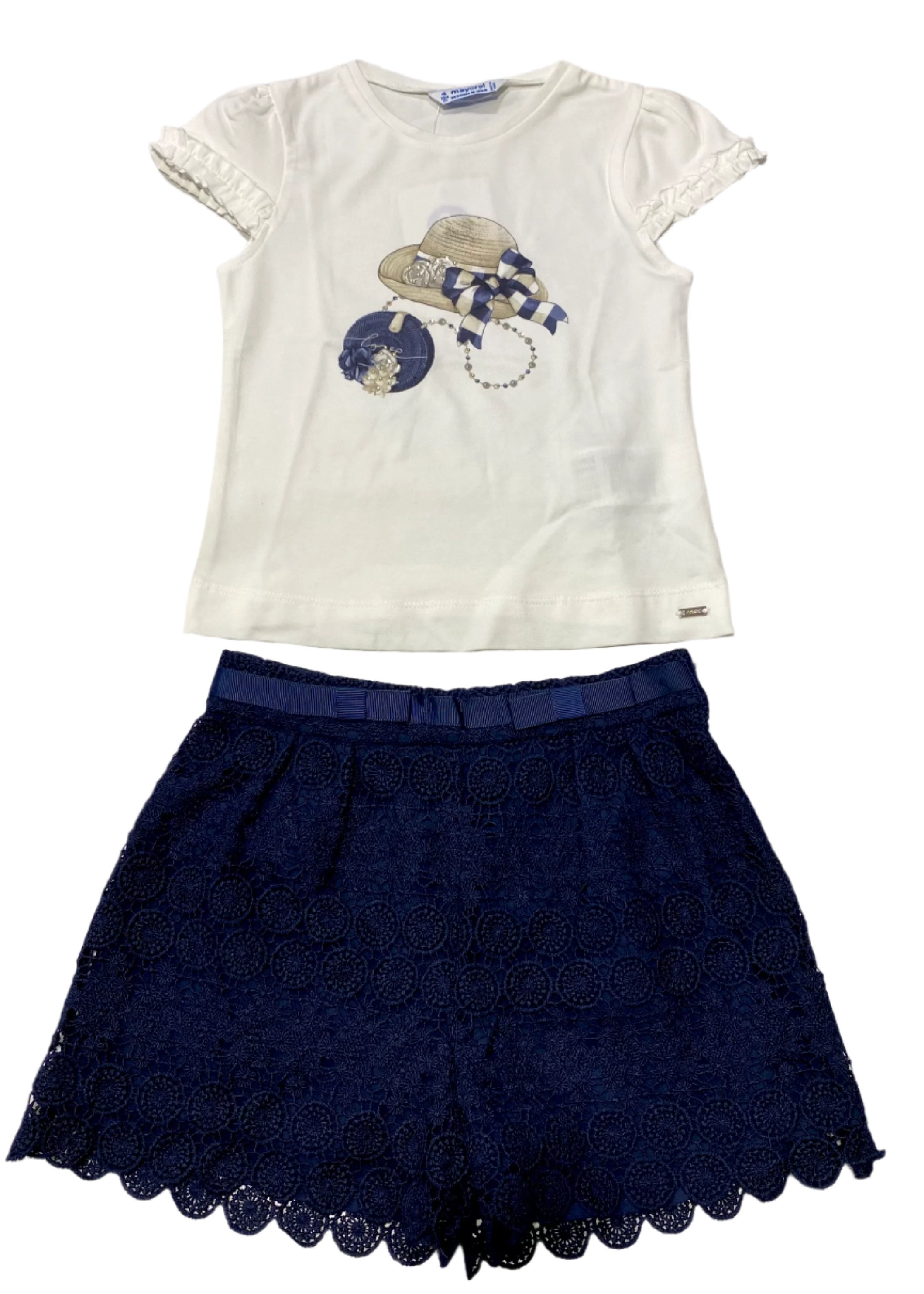Lovely girl's outfit. Top has short sleeve with ruffle details and has sun hat print and bow on the chest. This top has matching lace short, zip fastening on the side.