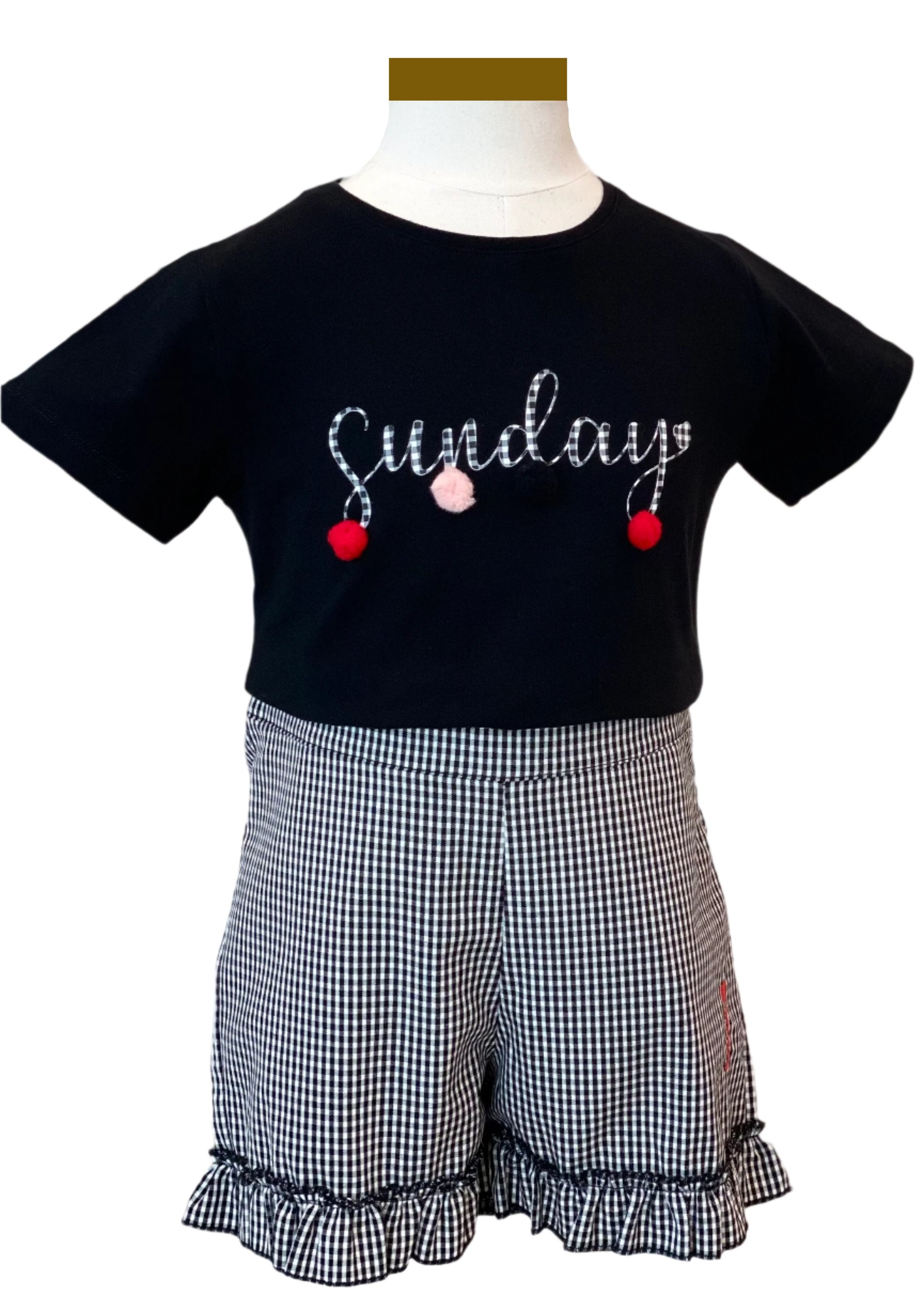 Pretty, casual girl's outfit. This set comes with a top embroidered with 'Sunday' design and mini pompom applique, it also comes with a short in a mini check pattern design with ruffles on the leg hem