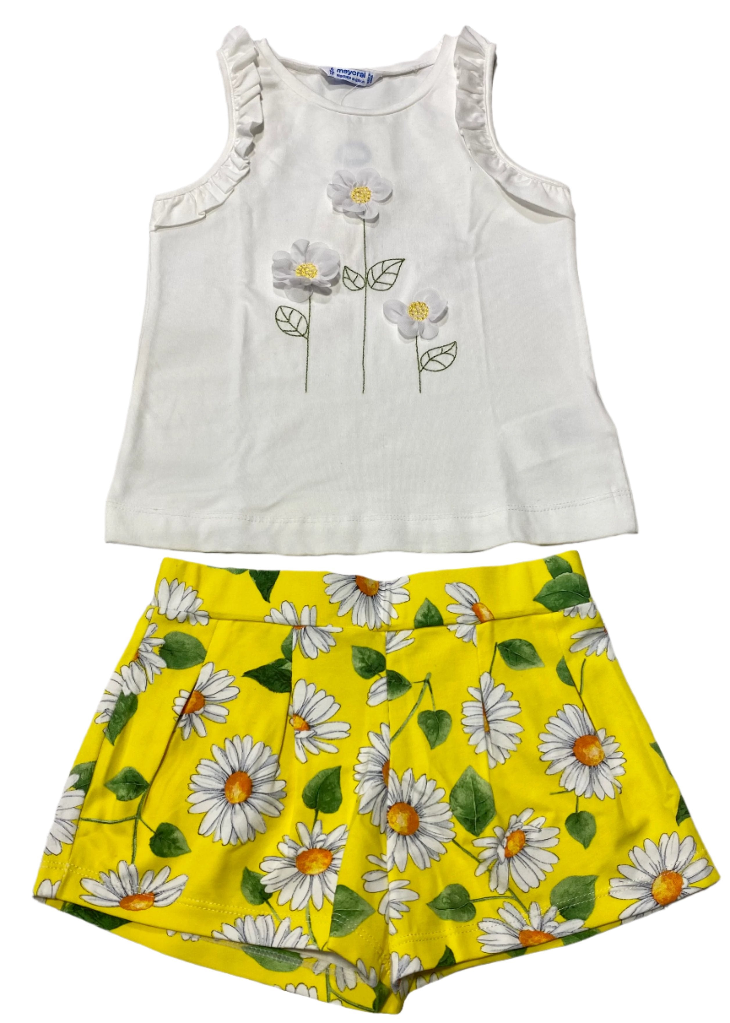 Lovely girl short set. This comes with a sleeveless top and a short. Both has sunflower design. Top has sunflower applique and embroidery while short has an all-over sunflower print.