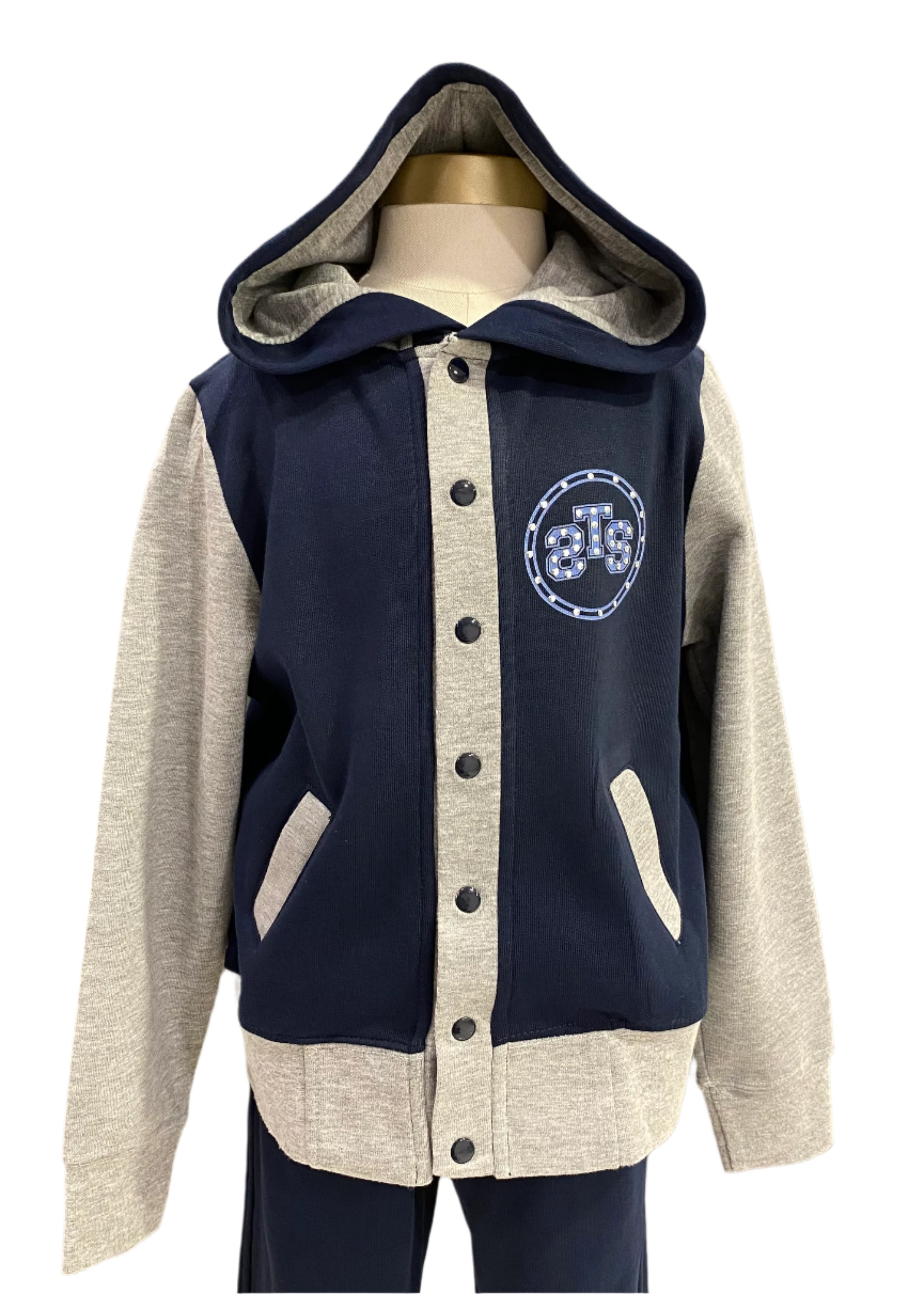 A two-color hoodie jacket from T-Shirt T-Shops. It is designed with sneakers print at the back and a brand logo on the left chest, that is enhanced with Swarovski studs. Front button snap opening. Has pockets on both sides. Made in Italy.