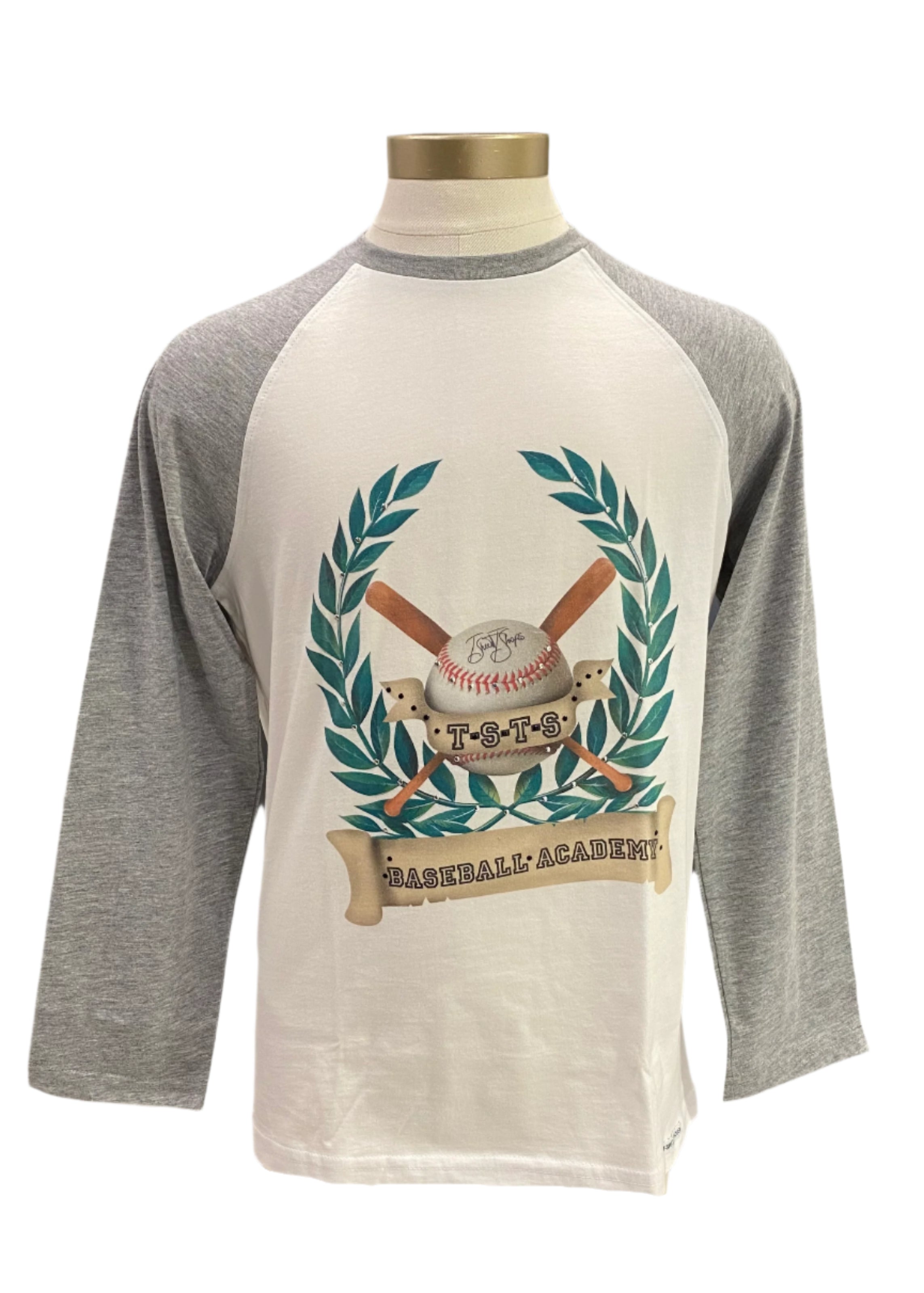 A simple white and grey top from T-Shirt T-Shops. Made with 100% soft cotton. It has a baseball ball and a green leaves print on the center, a "baseball academy" writing below, and a real Swarovski element. It has also a round grey neckline and sleeves.