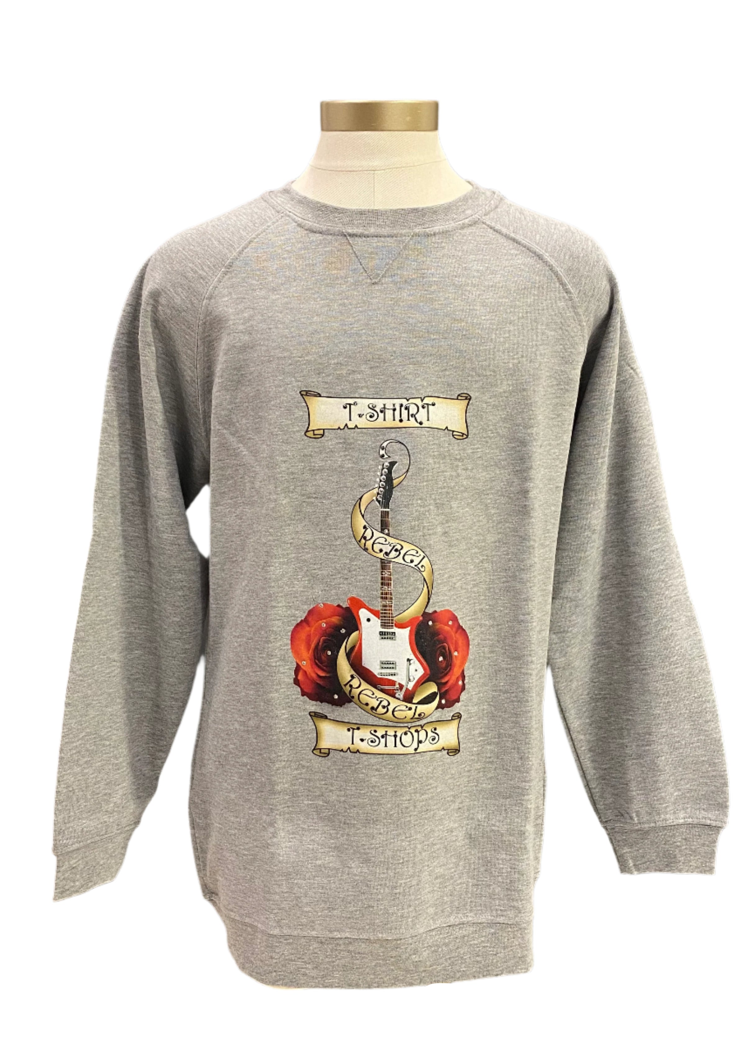 Boys swaggy sweater from T-Shirt T-Shops. It is made with a soft cotton and polyester fabric. It has a guitar and roses print on the front surrounded by a shiny and sparkling beads and Swarovski crystals. Has knit cuffs. Good for winter outfits.