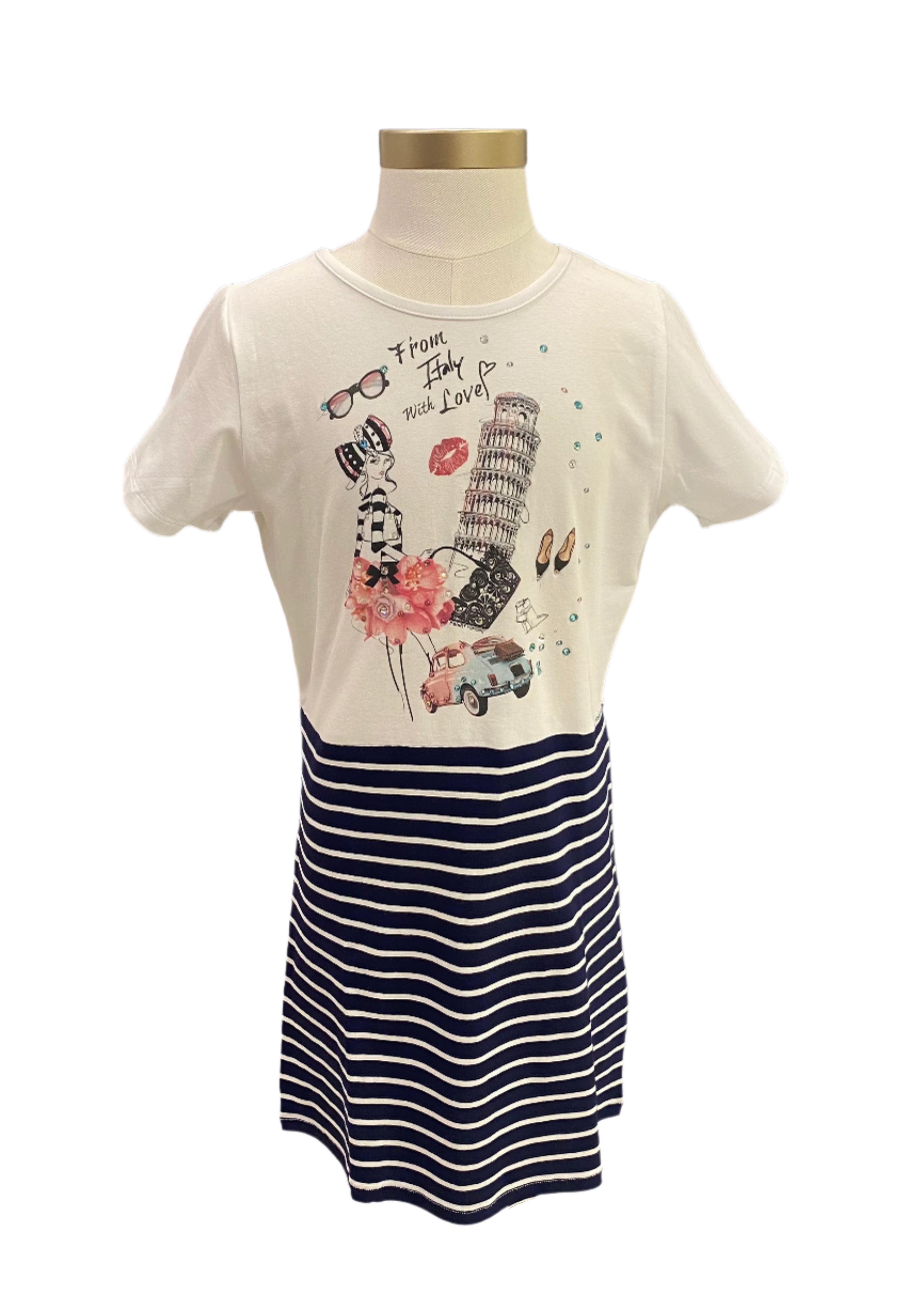 A stunning striped dress from T-Shirt T-Shops. It is printed with luxurious item and a tower of pisa, which is enhance by the real Swarovski crystal for a more lovely look.