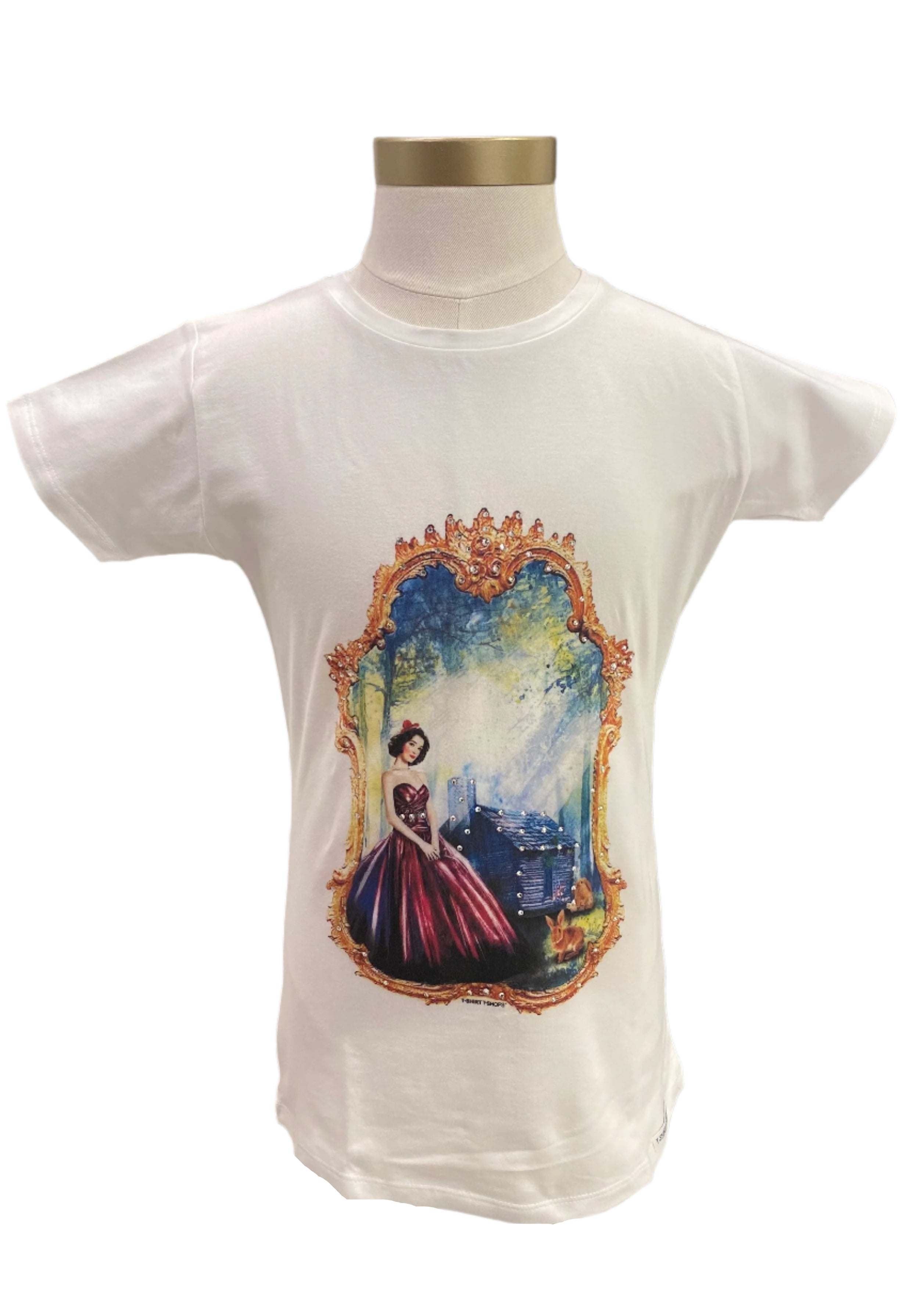 A lovely top by T-Shirt T-Shops. This t-shirt is designed with a Cinderella print, finished with real Swarovski crystals. This has a round neckline a short sleeves. Made in Italy.